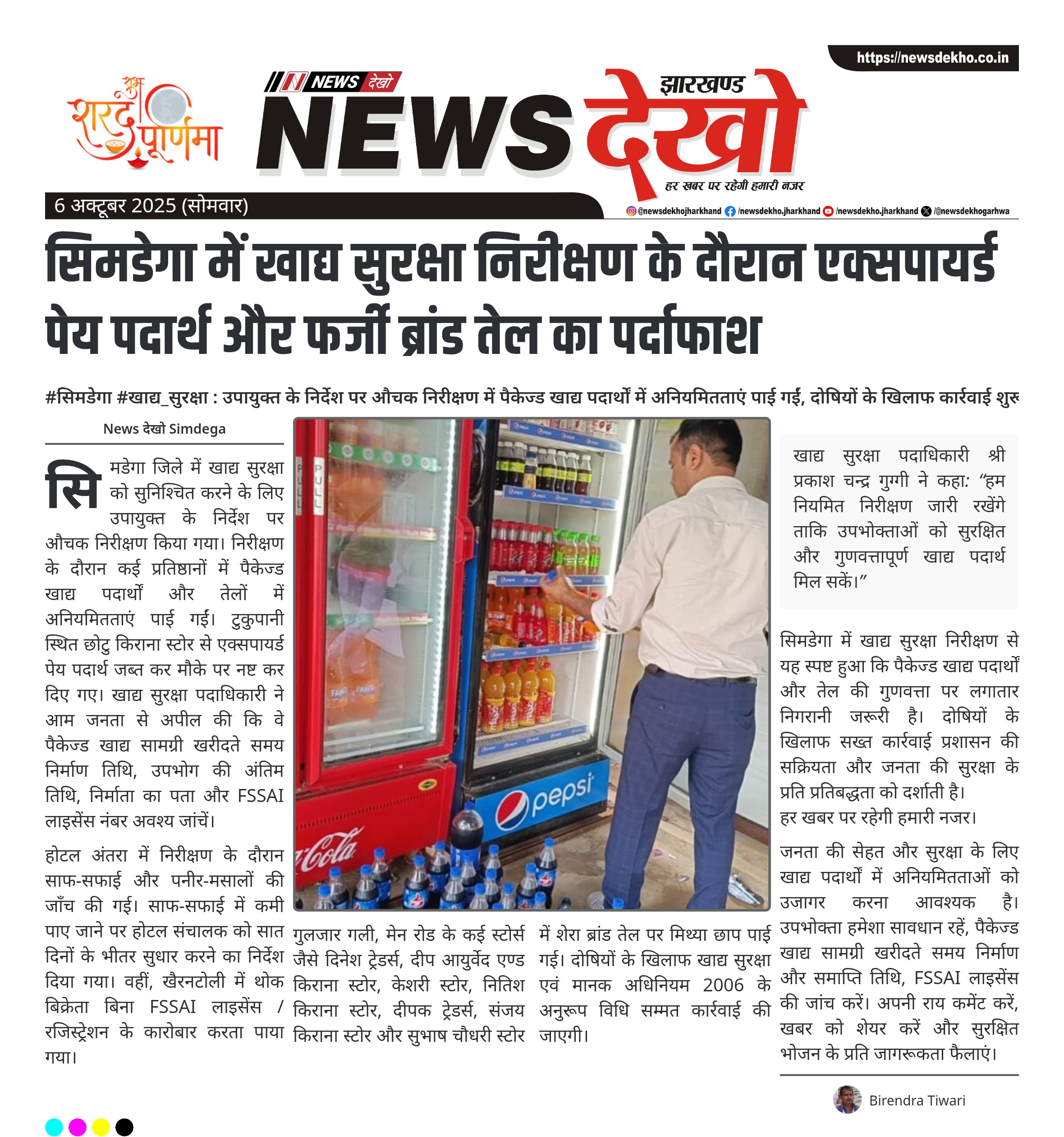 सिमडेगा में खाद्य सुरक्षा निरीक्षण के दौरान एक्सपायर्ड पेय पदार्थ और फर्जी ब्रांड तेल का पर्दाफाश