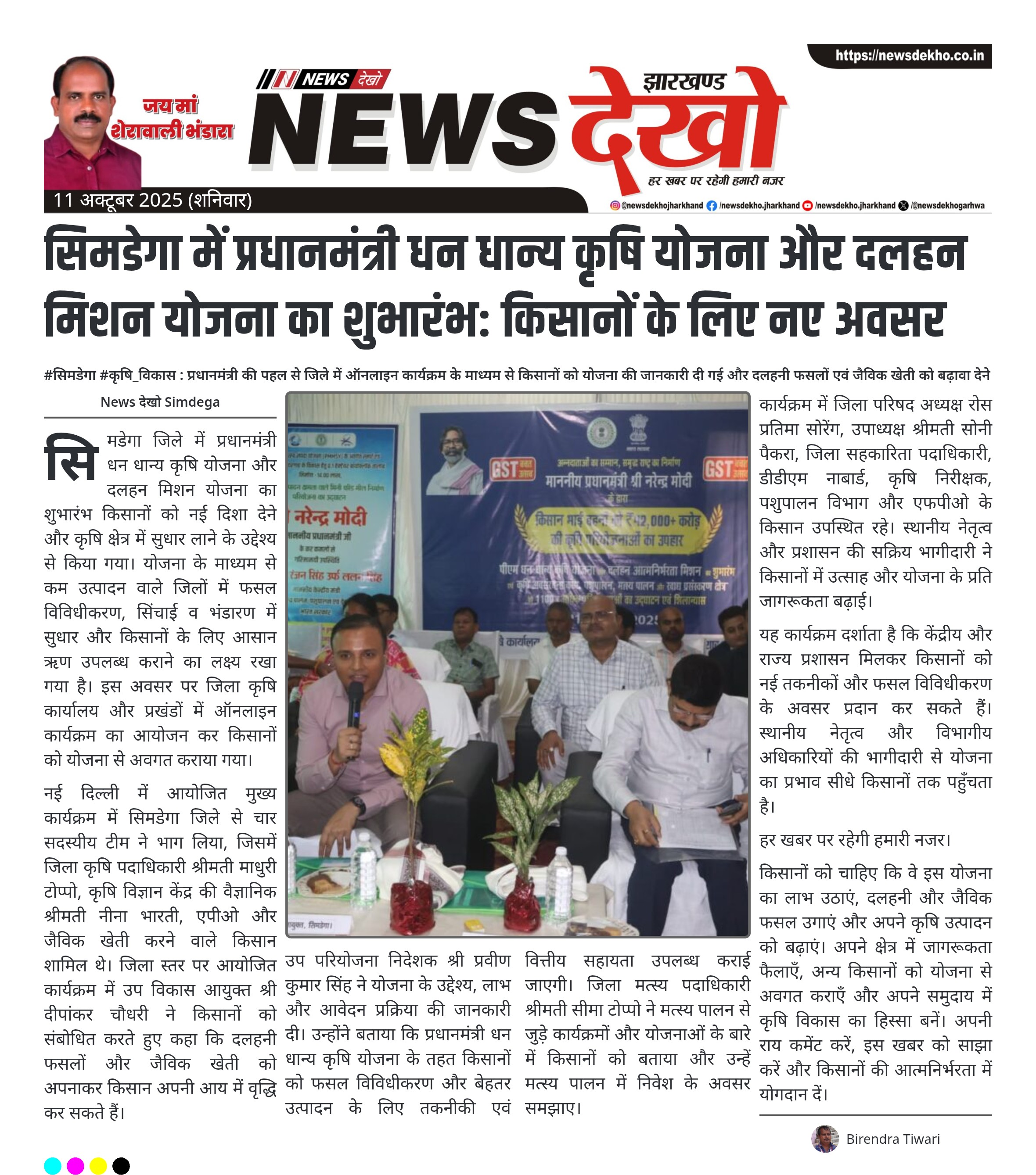 #सिमडेगा #कृषि_विकास : प्रधानमंत्री की पहल से जिले में ऑनलाइन कार्यक्रम के माध्यम से किसानों को योजना की जानकारी दी गई और दलहनी फसलों एवं जैविक खेती को बढ़ावा देने का आह्वान प्रधानमंत्री श्री नरेन्द्र मोदी ने प्रधानमंत्री धन धान्य कृषि योजना (PMDDKY) एवं दलहन मिशन योजना का राष्ट्रीय स्तर पर शुभारंभ किया। झारखंड के सिमडेगा और पश्चिमी सिंहभूम जिलों को इस योजना के प्रथम चरण में चिन्हित किया गया। जिला मुख्यालय स्तर पर उप विकास आयुक्त श्री दीपांकर चौधरी…