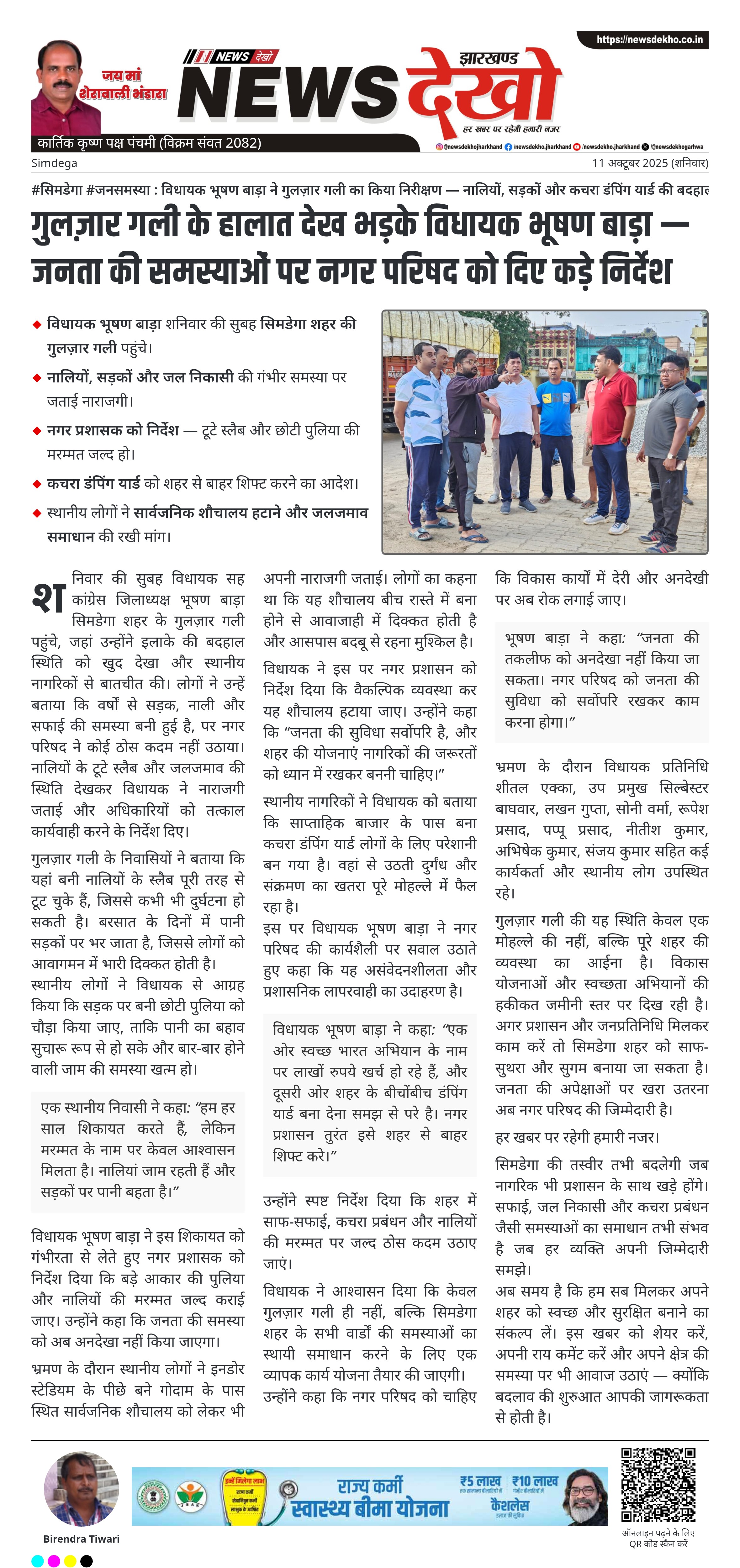 #सिमडेगा #जनसमस्या : विधायक भूषण बाड़ा ने गुलज़ार गली का किया निरीक्षण — नालियों, सड़कों और कचरा डंपिंग यार्ड की बदहाली पर जताई नाराजगी विधायक भूषण बाड़ा शनिवार की सुबह सिमडेगा शहर की गुलज़ार गली पहुंचे। नालियों, सड़कों और जल निकासी की गंभीर समस्या पर जताई नाराजगी। नगर प्रशासक को निर्देश — टूटे स्लैब और छोटी पुलिया की मरम्मत जल्द हो। कचरा डंपिंग यार्ड को शहर से बाहर शिफ्ट करने का आदेश। स्थानीय लोगों ने सार्वजनिक शौचालय हटाने और जलजमाव…