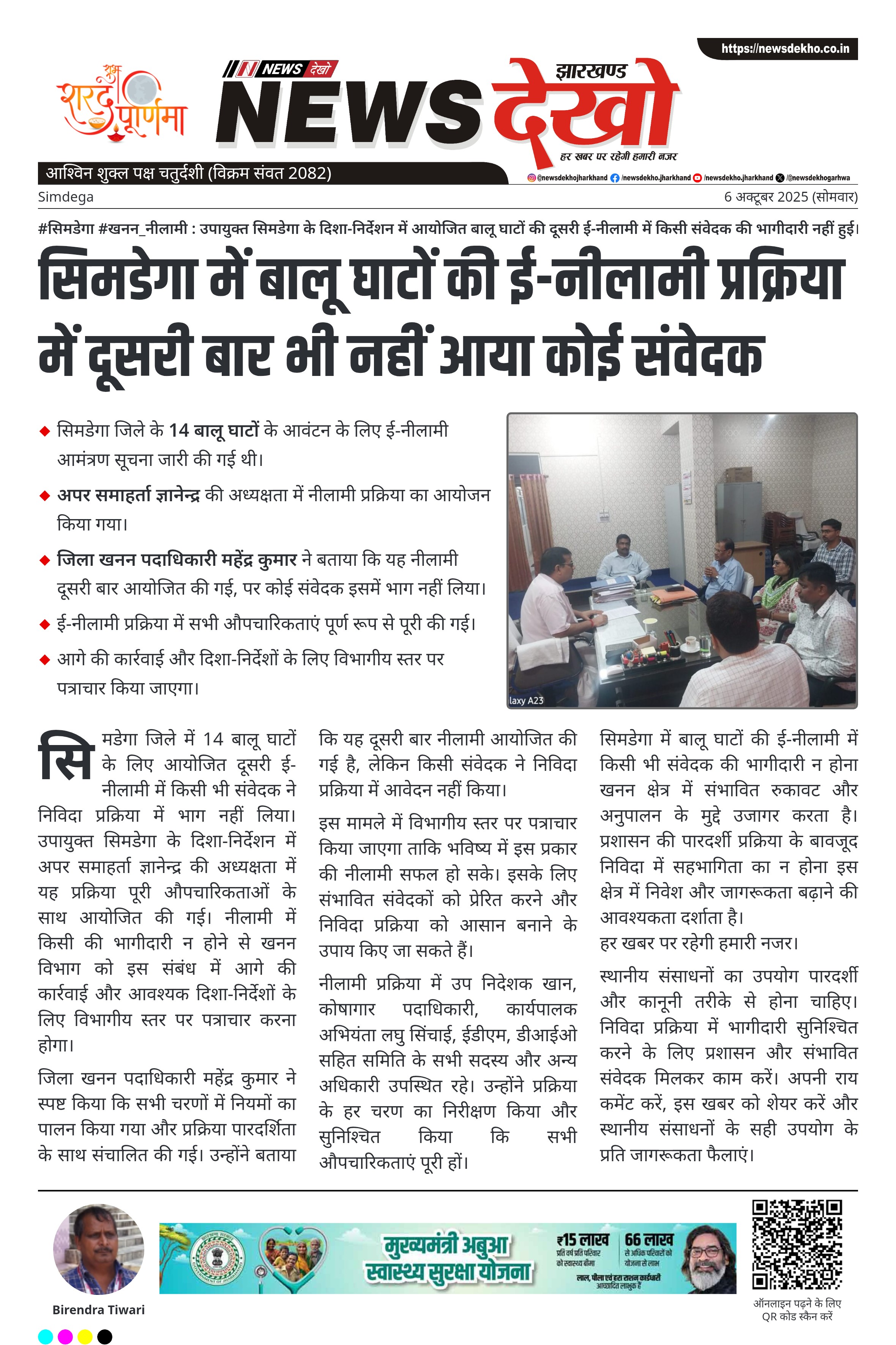 #सिमडेगा #खनन_नीलामी : उपायुक्त सिमडेगा के दिशा-निर्देशन में आयोजित बालू घाटों की दूसरी ई-नीलामी में किसी संवेदक की भागीदारी नहीं हुई। सिमडेगा जिले के 14 बालू घाटों के आवंटन के लिए ई-नीलामी आमंत्रण सूचना जारी की गई थी। अपर समाहर्ता ज्ञानेन्द्र की अध्यक्षता में नीलामी प्रक्रिया का आयोजन किया गया। जिला खनन पदाधिकारी महेंद्र कुमार ने बताया कि यह नीलामी दूसरी बार आयोजित की गई, पर कोई संवेदक इसमें भाग नहीं लिया। ई-नीलामी प्रक्रिया में सभी औपचारिकताएं पूर्ण रूप से…