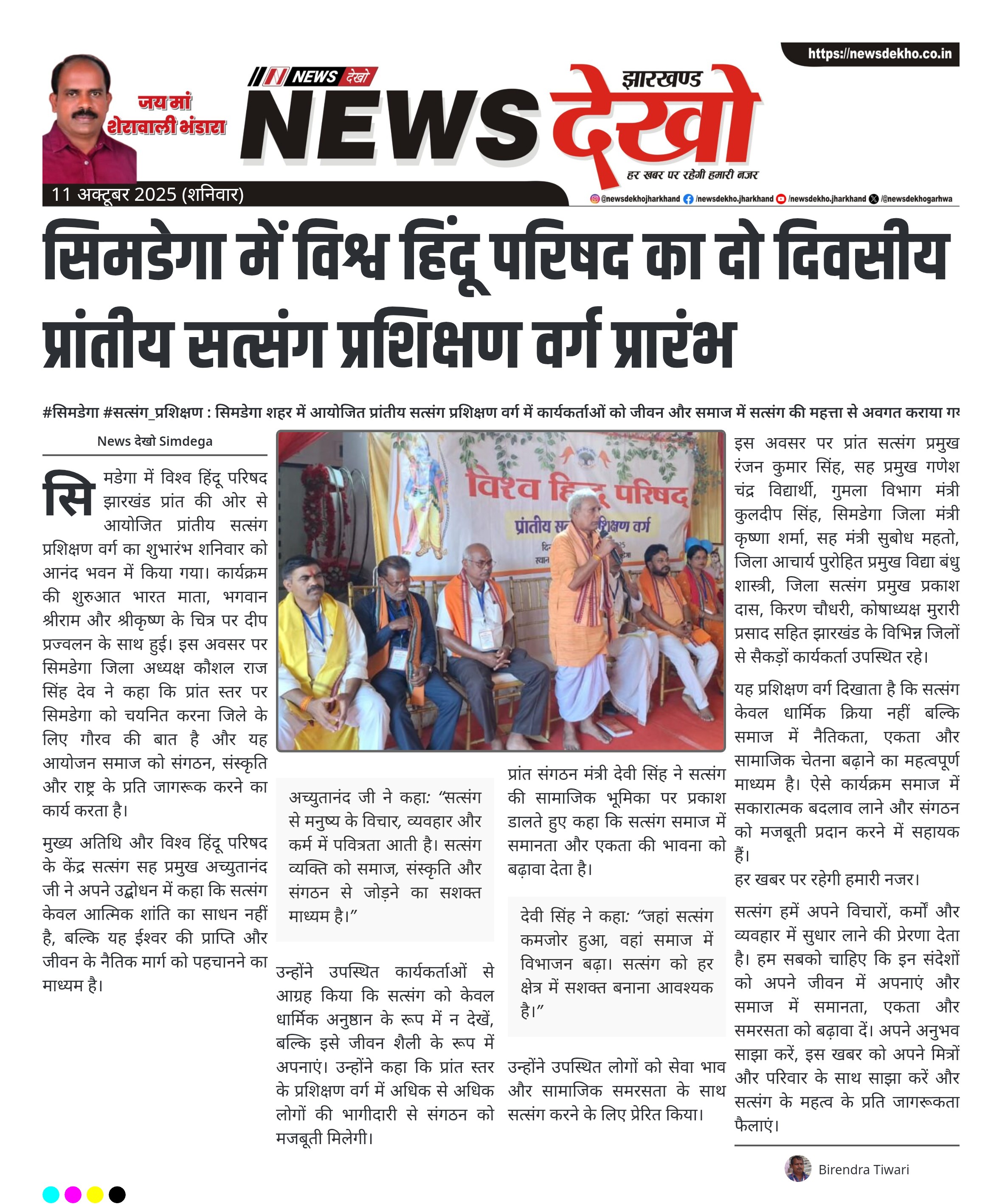 #सिमडेगा #सत्संग_प्रशिक्षण : सिमडेगा शहर में आयोजित प्रांतीय सत्संग प्रशिक्षण वर्ग में कार्यकर्ताओं को जीवन और समाज में सत्संग की महत्ता से अवगत कराया गया विश्व हिंदू परिषद झारखंड प्रांत द्वारा सिमडेगा आनंद भवन में दो दिवसीय सत्संग प्रशिक्षण वर्ग का शुभारंभ। उद्घाटन अवसर पर भारत माता, भगवान श्रीराम और श्रीकृष्ण के चित्र पर दीप प्रज्वलन किया गया। मुख्य अतिथि अच्युतानंद जी ने कहा कि सत्संग से व्यक्ति के विचार, व्यवहार और कर्म में पवित्रता आती है। प्रांत संगठन मंत्री…