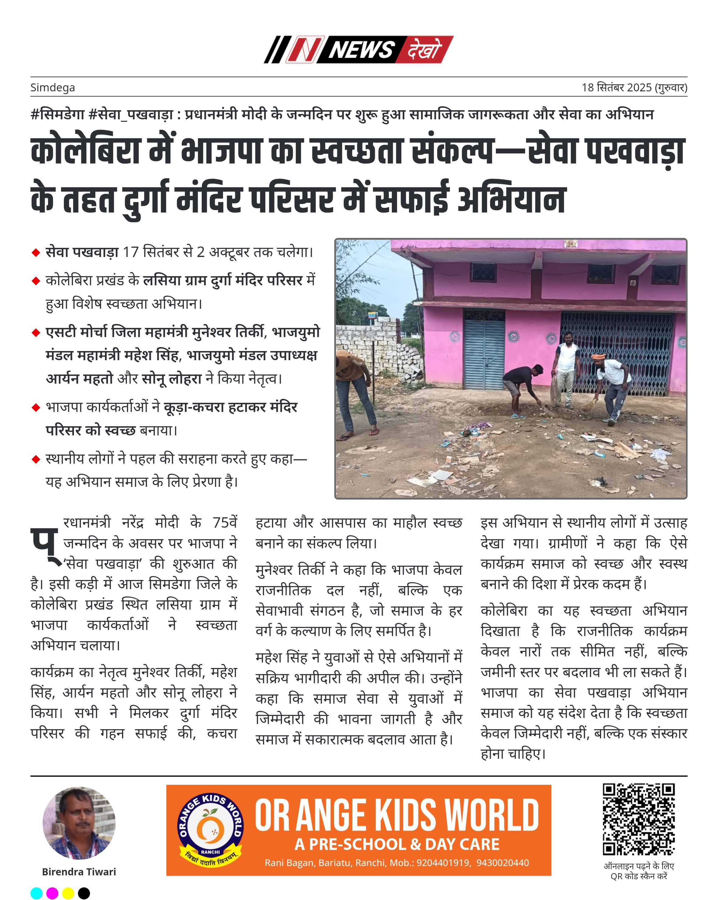 #सिमडेगा #सेवा_पखवाड़ा : प्रधानमंत्री मोदी के जन्मदिन पर शुरू हुआ सामाजिक जागरूकता और सेवा का अभियान सेवा पखवाड़ा 17 सितंबर से 2 अक्टूबर तक चलेगा। कोलेबिरा प्रखंड के लसिया ग्राम दुर्गा मंदिर परिसर में हुआ विशेष स्वच्छता अभियान। एसटी मोर्चा जिला महामंत्री मुनेश्वर तिर्की, भाजयुमो मंडल महामंत्री महेश सिंह, भाजयुमो मंडल उपाध्यक्ष आर्यन महतो और सोनू लोहरा ने किया नेतृत्व। भाजपा कार्यकर्ताओं ने कूड़ा-कचरा हटाकर मंदिर परिसर को स्वच्छ बनाया। स्थानीय लोगों ने पहल की सराहना करते हुए कहा—यह अभियान…