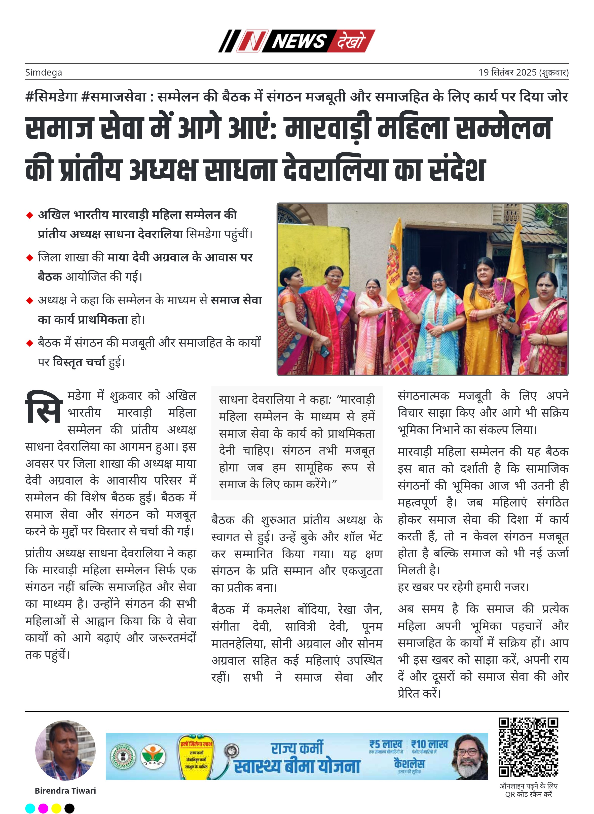 समाज सेवा में आगे आएं: मारवाड़ी महिला सम्मेलन की प्रांतीय अध्यक्ष साधना देवरालिया का संदेश