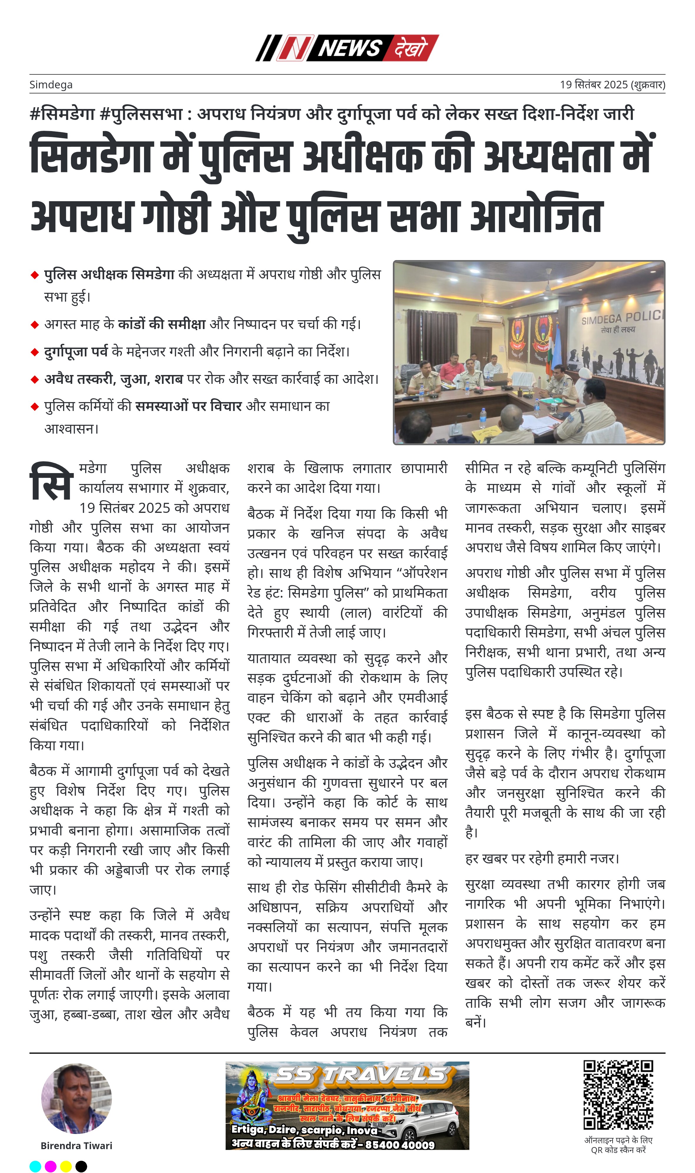 #सिमडेगा #पुलिससभा : अपराध नियंत्रण और दुर्गापूजा पर्व को लेकर सख्त दिशा-निर्देश जारी पुलिस अधीक्षक सिमडेगा की अध्यक्षता में अपराध गोष्ठी और पुलिस सभा हुई। अगस्त माह के कांडों की समीक्षा और निष्पादन पर चर्चा की गई। दुर्गापूजा पर्व के मद्देनजर गश्ती और निगरानी बढ़ाने का निर्देश। अवैध तस्करी, जुआ, शराब पर रोक और सख्त कार्रवाई का आदेश। पुलिस कर्मियों की समस्याओं पर विचार और समाधान का आश्वासन। सिमडेगा पुलिस अधीक्षक कार्यालय सभागार में शुक्रवार, 19 सितंबर 2025 को अपराध…
