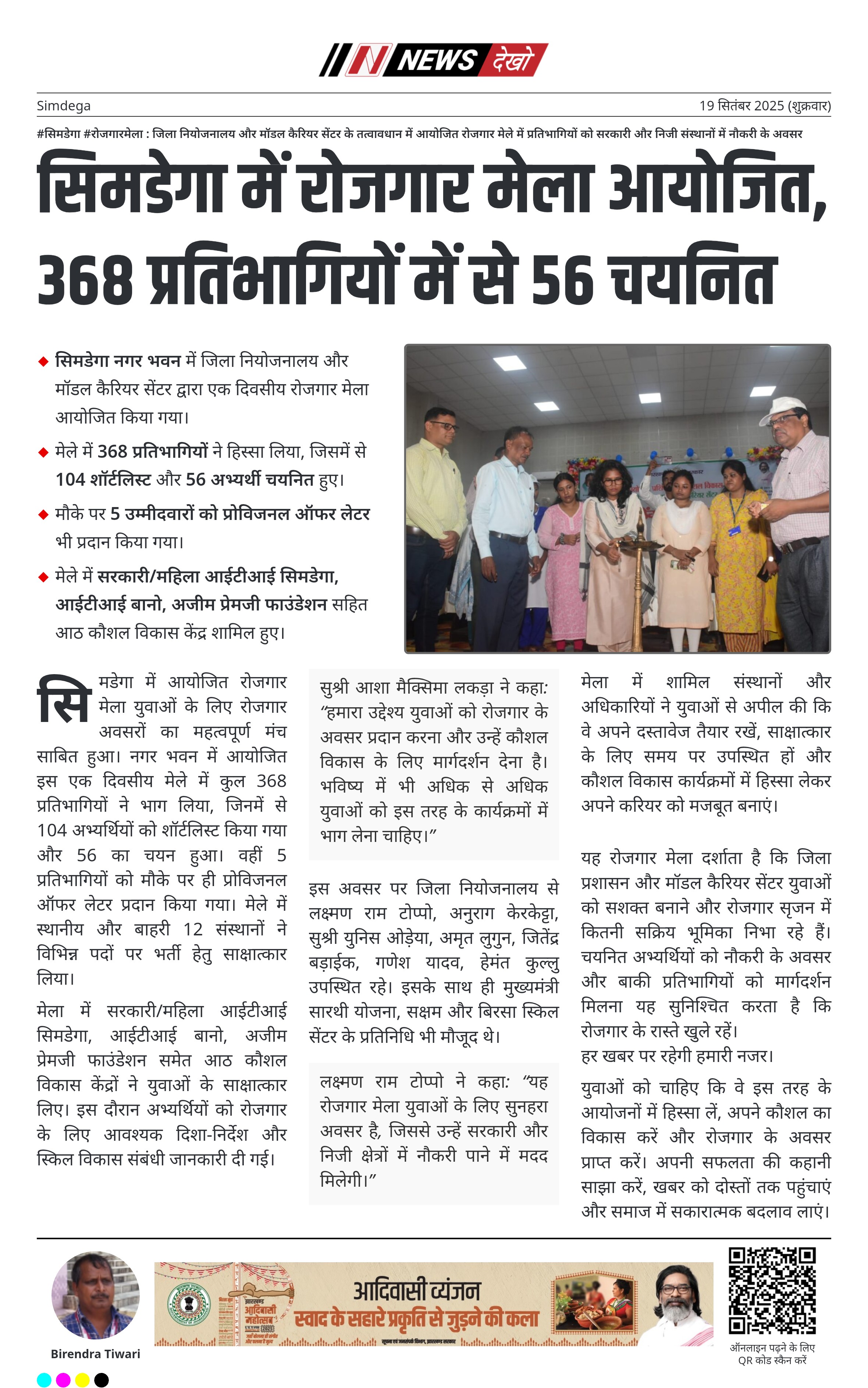 #सिमडेगा #रोजगारमेला : जिला नियोजनालय और मॉडल कैरियर सेंटर के तत्वावधान में आयोजित रोजगार मेले में प्रतिभागियों को सरकारी और निजी संस्थानों में नौकरी के अवसर सिमडेगा नगर भवन में जिला नियोजनालय और मॉडल कैरियर सेंटर द्वारा एक दिवसीय रोजगार मेला आयोजित किया गया। मेले में 368 प्रतिभागियों ने हिस्सा लिया, जिसमें से 104 शॉर्टलिस्ट और 56 अभ्यर्थी चयनित हुए। मौके पर 5 उम्मीदवारों को प्रोविजनल ऑफर लेटर भी प्रदान किया गया। मेले में सरकारी/महिला आईटीआई सिमडेगा, आईटीआई बानो, अजीम…