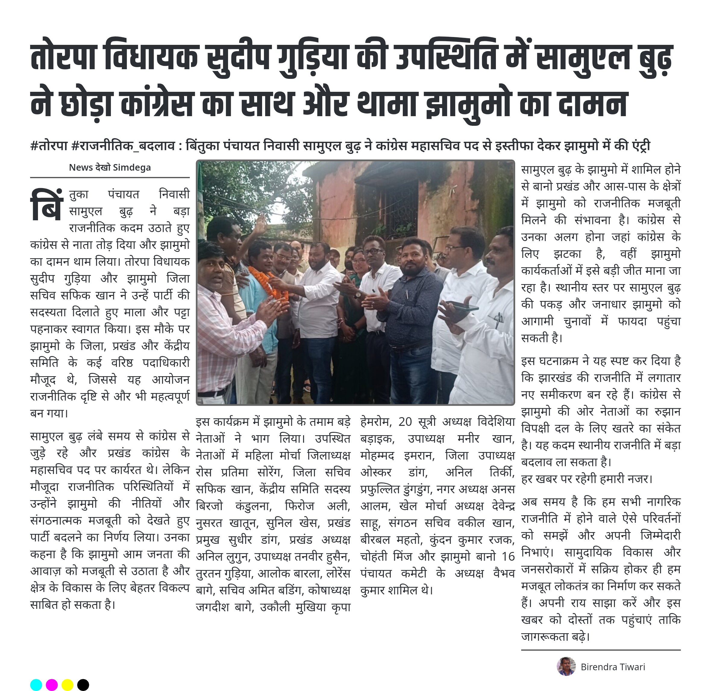 तोरपा विधायक सुदीप गुड़िया की उपस्थिति में सामुएल बुढ़ ने छोड़ा कांग्रेस का साथ और थामा झामुमो का दामन