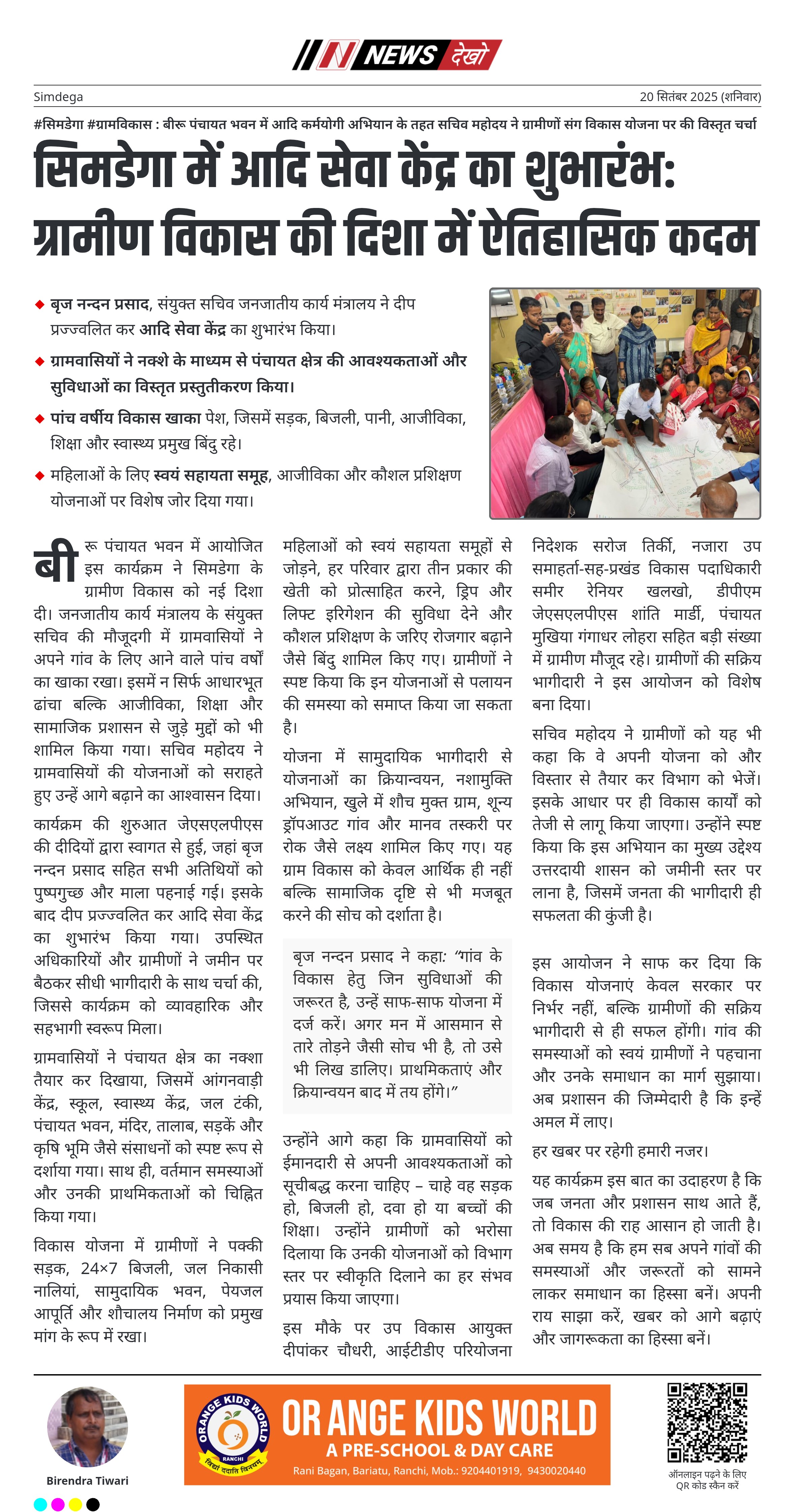 #सिमडेगा #ग्रामविकास : बीरू पंचायत भवन में आदि कर्मयोगी अभियान के तहत सचिव महोदय ने ग्रामीणों संग विकास योजना पर की विस्तृत चर्चा बृज नन्दन प्रसाद, संयुक्त सचिव जनजातीय कार्य मंत्रालय ने दीप प्रज्ज्वलित कर आदि सेवा केंद्र का शुभारंभ किया। उप विकास आयुक्त दीपांकर चौधरी, आईटीडीए निदेशक सरोज तिर्की सहित प्रशासनिक अधिकारी व बड़ी संख्या में ग्रामीण उपस्थित। ग्रामवासियों ने नक्शे के माध्यम से पंचायत क्षेत्र की आवश्यकताओं और सुविधाओं का विस्तृत प्रस्तुतीकरण किया। पांच वर्षीय विकास खाका पेश,…