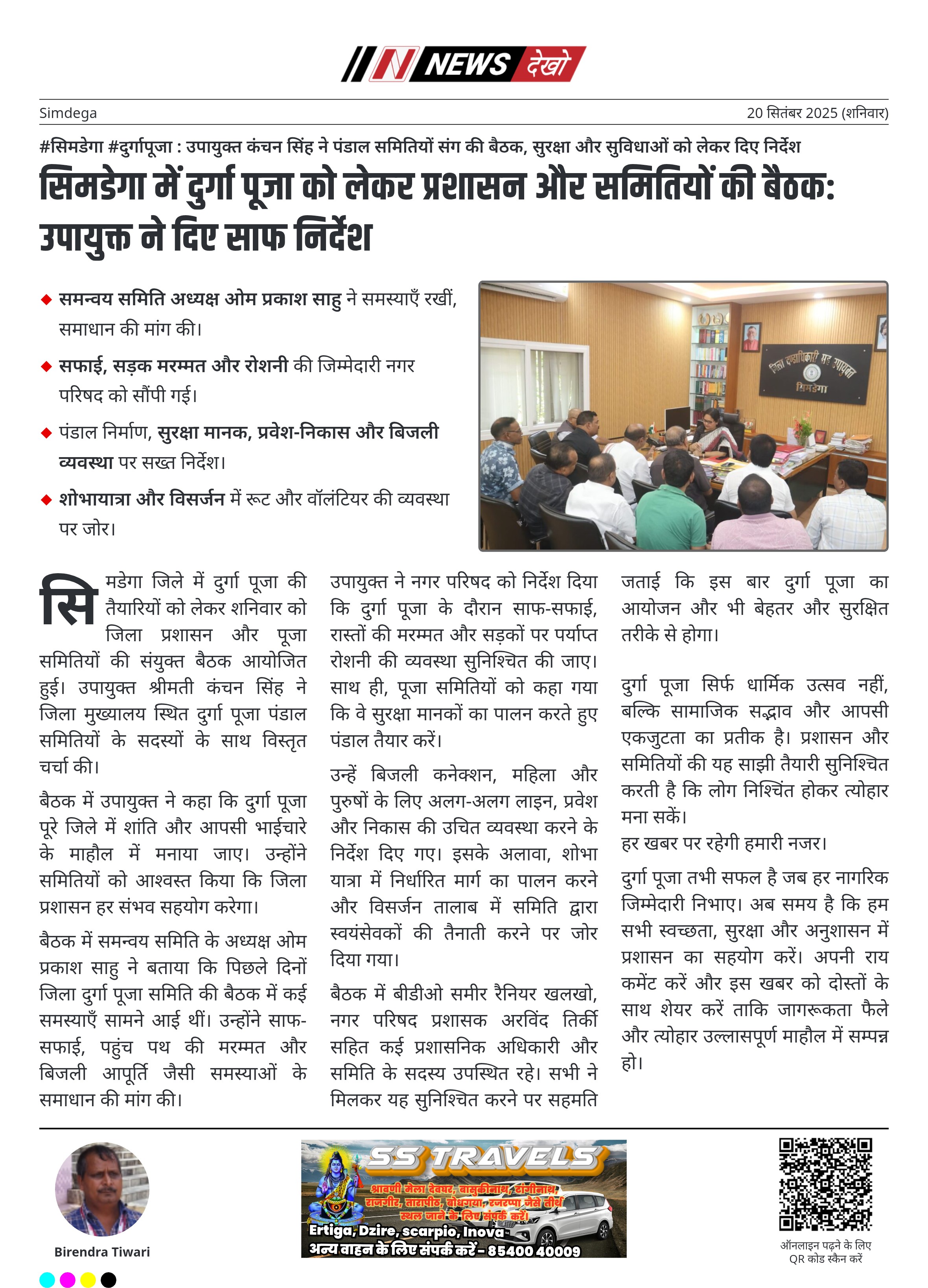 #सिमडेगा #दुर्गापूजा : उपायुक्त कंचन सिंह ने पंडाल समितियों संग की बैठक, सुरक्षा और सुविधाओं को लेकर दिए निर्देश उपायुक्त कंचन सिंह ने जिला मुख्यालय में दुर्गा पूजा पंडाल समितियों संग बैठक की। शांतिपूर्ण और सौहार्दपूर्ण वातावरण में पूजा कराने की अपील। समन्वय समिति अध्यक्ष ओम प्रकाश साहु ने समस्याएँ रखीं, समाधान की मांग की। सफाई, सड़क मरम्मत और रोशनी की जिम्मेदारी नगर परिषद को सौंपी गई। पंडाल निर्माण, सुरक्षा मानक, प्रवेश-निकास और बिजली व्यवस्था पर सख्त निर्देश। शोभायात्रा और…
