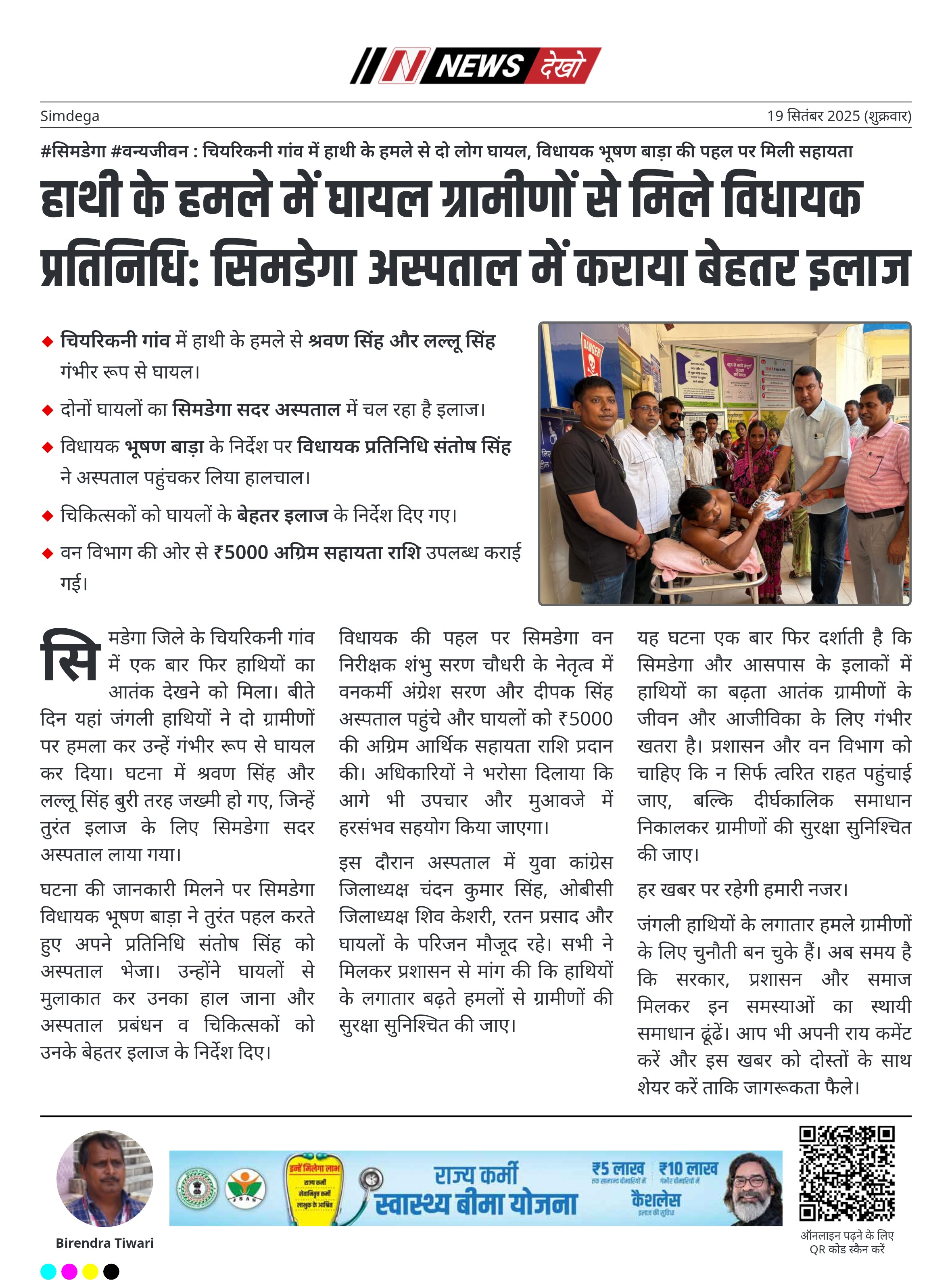 #सिमडेगा #वन्यजीवन : चियरिकनी गांव में हाथी के हमले से दो लोग घायल, विधायक भूषण बाड़ा की पहल पर मिली सहायता चियरिकनी गांव में हाथी के हमले से श्रवण सिंह और लल्लू सिंह गंभीर रूप से घायल। दोनों घायलों का सिमडेगा सदर अस्पताल में चल रहा है इलाज। विधायक भूषण बाड़ा के निर्देश पर विधायक प्रतिनिधि संतोष सिंह ने अस्पताल पहुंचकर लिया हालचाल। चिकित्सकों को घायलों के बेहतर इलाज के निर्देश दिए गए। वन विभाग की ओर से ₹5000 अग्रिम…
