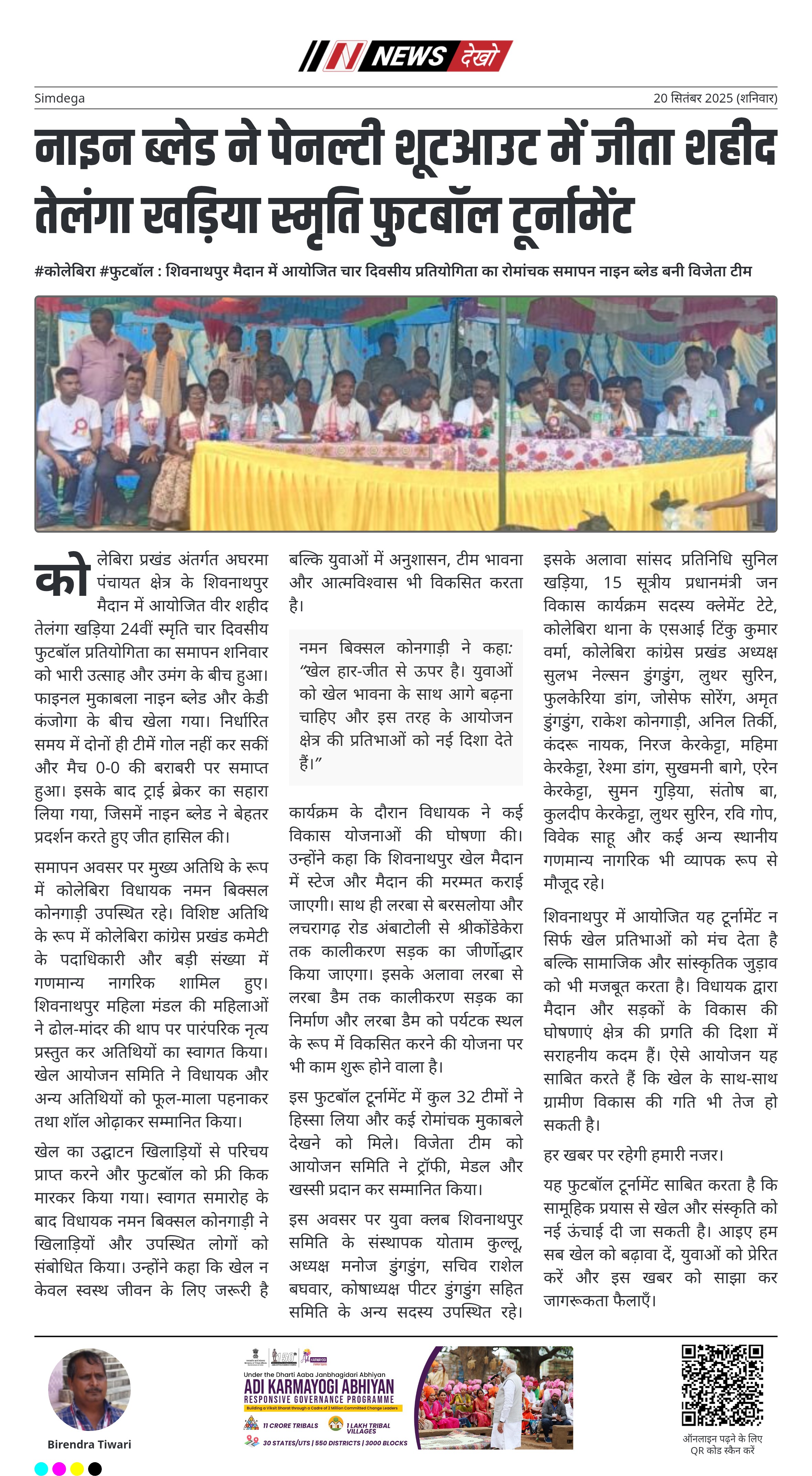 #कोलेबिरा #फुटबॉल : शिवनाथपुर मैदान में आयोजित चार दिवसीय प्रतियोगिता का रोमांचक समापन नाइन ब्लेड बनी विजेता टीम शिवनाथपुर मैदान में आयोजित चार दिवसीय फुटबॉल टूर्नामेंट का हुआ समापन। फाइनल में नाइन ब्लेड और केडी कंजोगा के बीच कड़ा मुकाबला। निर्धारित समय में 0-0 की बराबरी, पेनल्टी शूटआउट में नाइन ब्लेड विजयी। मुख्य अतिथि विधायक नमन बिक्सल कोनगाड़ी ने खिलाड़ियों को प्रेरित किया। विधायक ने स्टेज और मैदान के मरम्मत तथा क्षेत्रीय सड़कों के जीर्णोद्धार की घोषणा की। प्रतियोगिता में…