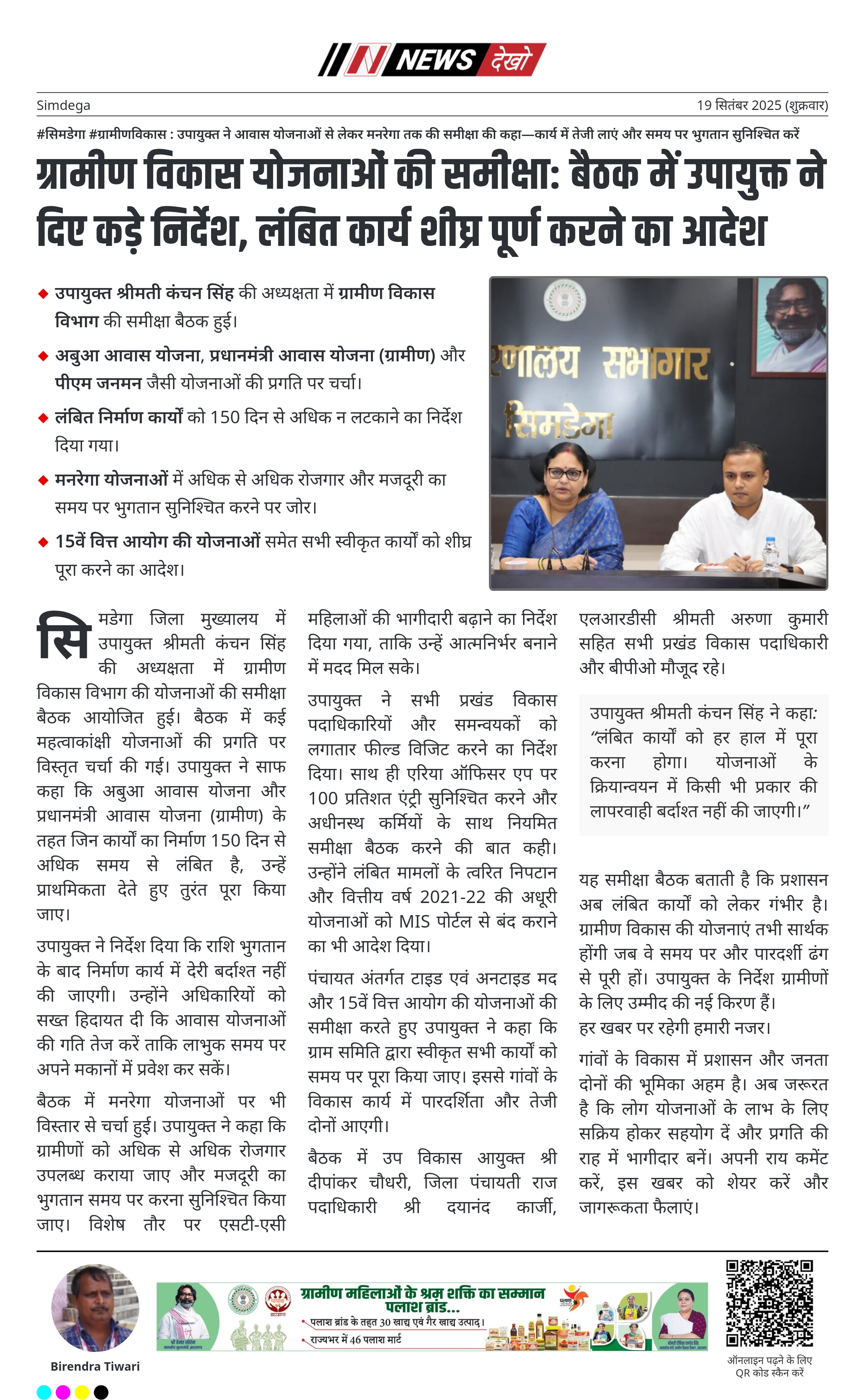 #सिमडेगा #ग्रामीणविकास : उपायुक्त ने आवास योजनाओं से लेकर मनरेगा तक की समीक्षा की कहा—कार्य में तेजी लाएं और समय पर भुगतान सुनिश्चित करें उपायुक्त श्रीमती कंचन सिंह की अध्यक्षता में ग्रामीण विकास विभाग की समीक्षा बैठक हुई। अबुआ आवास योजना, प्रधानमंत्री आवास योजना (ग्रामीण) और पीएम जनमन जैसी योजनाओं की प्रगति पर चर्चा। लंबित निर्माण कार्यों को 150 दिन से अधिक न लटकाने का निर्देश दिया गया। मनरेगा योजनाओं में अधिक से अधिक रोजगार और मजदूरी का समय पर…