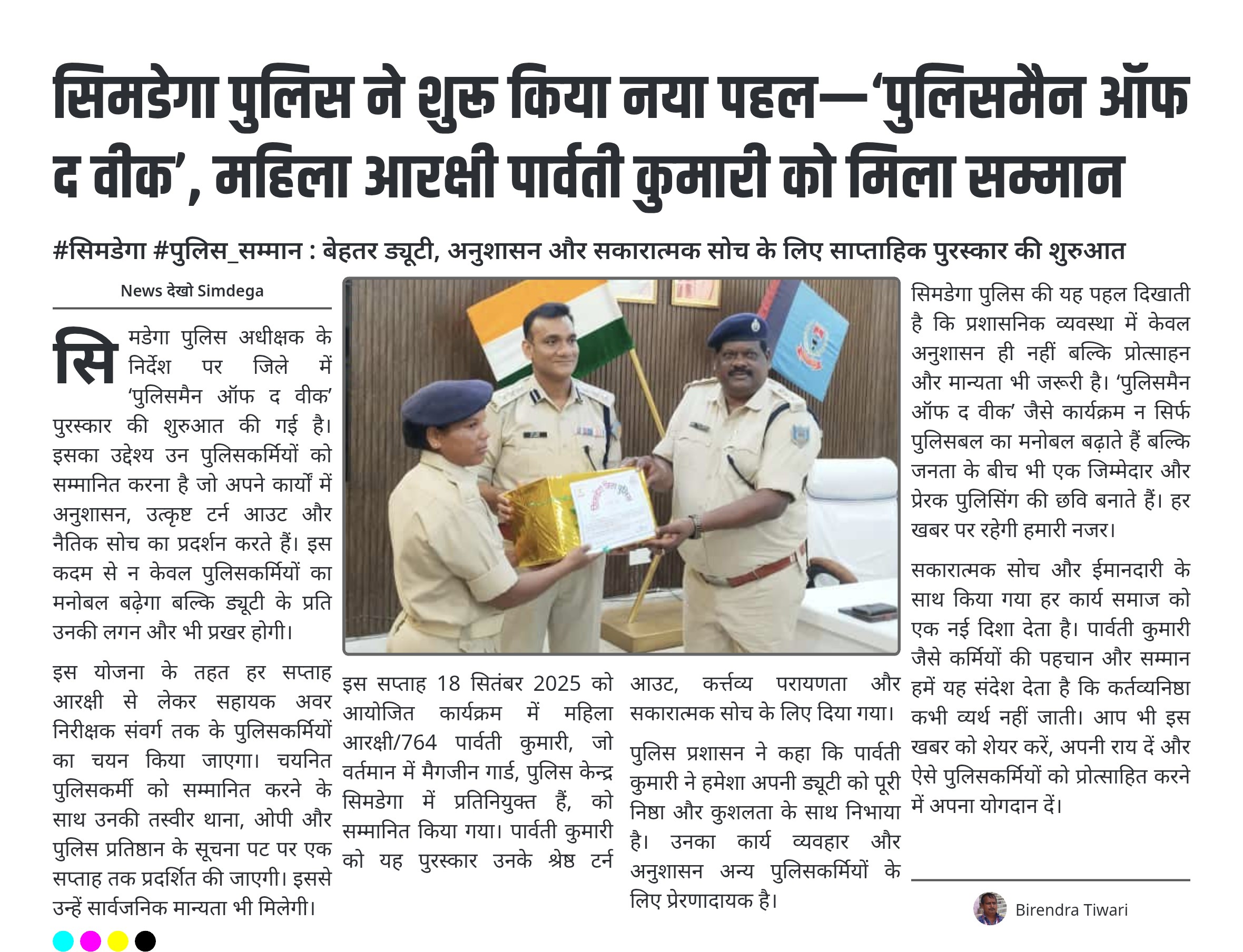 #सिमडेगा #पुलिस_सम्मान : बेहतर ड्यूटी, अनुशासन और सकारात्मक सोच के लिए साप्ताहिक पुरस्कार की शुरुआत सिमडेगा पुलिस अधीक्षक ने मनोबल बढ़ाने हेतु ‘पुलिसमैन ऑफ द वीक’ की शुरुआत की। हर सप्ताह आरक्षी से एएसआई स्तर तक के कर्मियों का होगा चयन। चयनित पुलिसकर्मी की तस्वीर थाना/ओपी/प्रतिष्ठान के सूचना पट पर लगाई जाएगी। इस सप्ताह का पुरस्कार महिला आरक्षी/764 पार्वती कुमारी को दिया गया। पार्वती कुमारी की कर्त्तव्य परायणता, टर्न आउट और नैतिक सोच रही सराहनीय। पुलिसकर्मियों के उत्साहवर्धन की नई…
