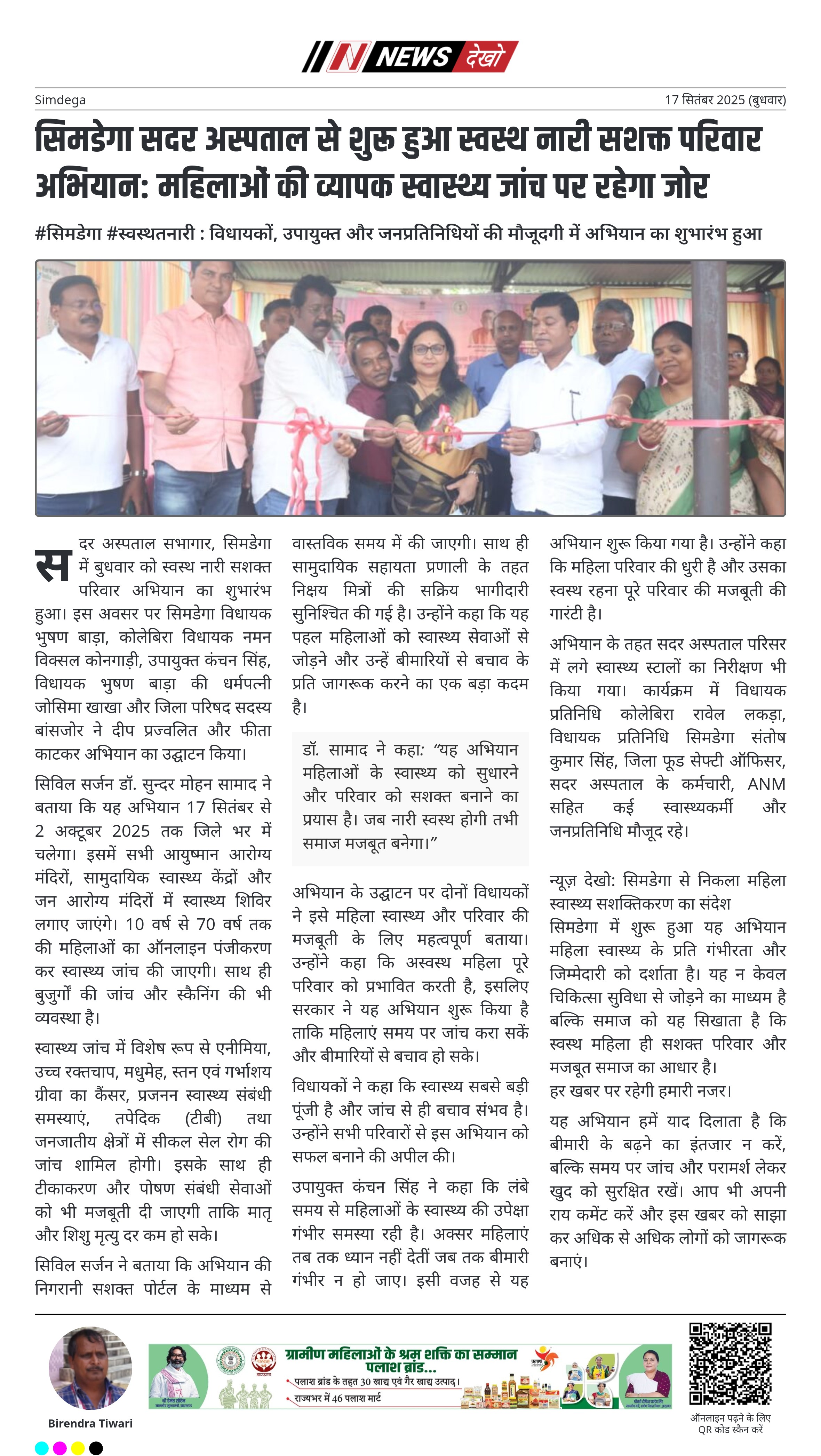 #सिमडेगा #स्वस्थतनारी : विधायकों, उपायुक्त और जनप्रतिनिधियों की मौजूदगी में अभियान का शुभारंभ हुआ विधायक भुषण बाड़ा, नमन विक्सल कोनगाड़ी और उपायुक्त कंचन सिंह ने दीप प्रज्वलित कर किया उद्घाटन। 17 सितंबर से 2 अक्टूबर 2025 तक चलेगा स्वस्थ नारी सशक्त परिवार अभियान। जिले भर में सभी आयुष्मान आरोग्य मंदिरों और स्वास्थ्य केंद्रों पर स्वास्थ्य शिविर आयोजित। 10 से 70 वर्ष की सभी महिलाओं का होगा ऑनलाइन रजिस्ट्रेशन और जांच। एनीमिया, कैंसर, मधुमेह, टीबी और सीकल सेल रोग जैसी बीमारियों…
