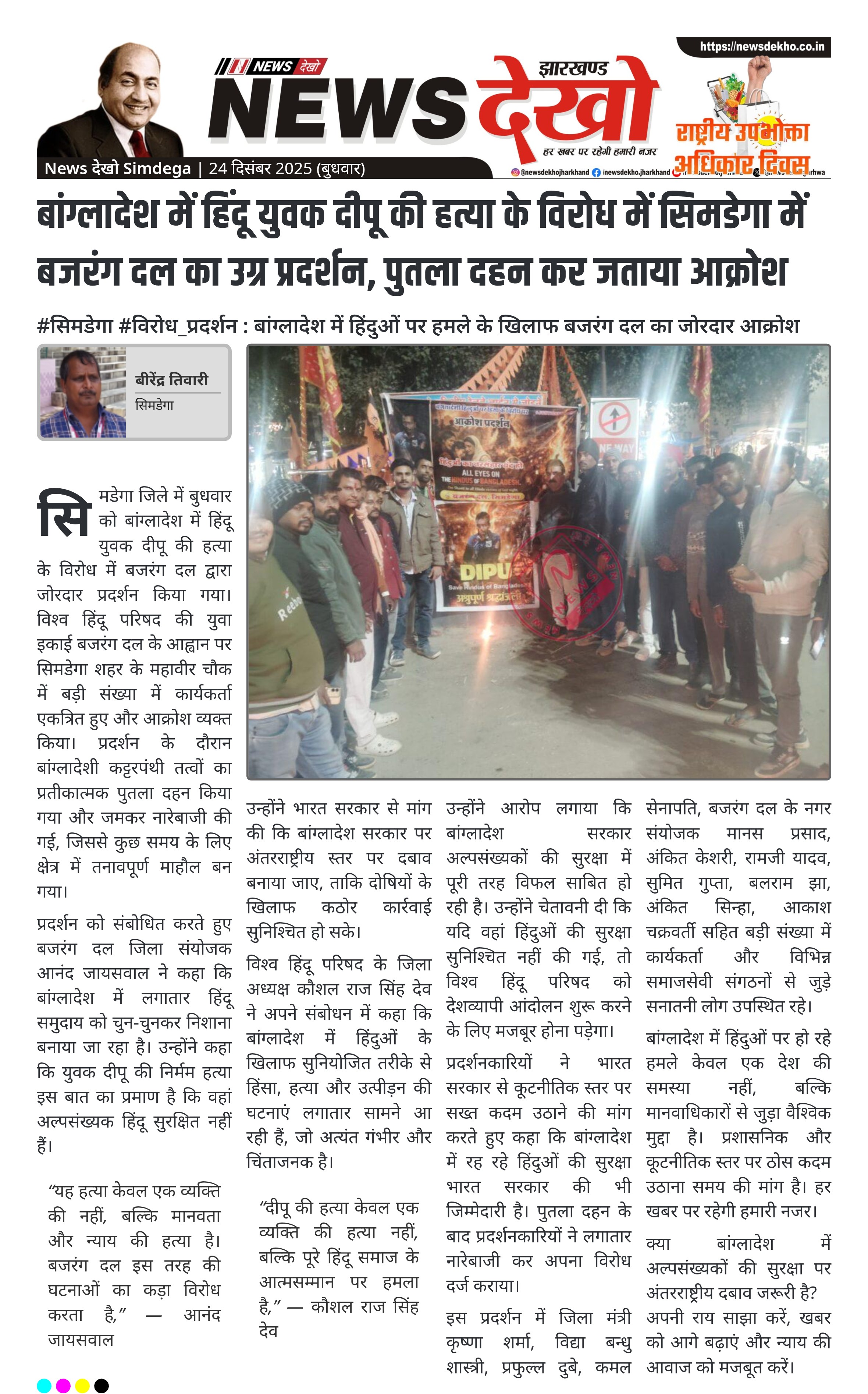 #सिमडेगा #विरोध_प्रदर्शन : बांग्लादेश में हिंदुओं पर हमले के खिलाफ बजरंग दल का जोरदार आक्रोश बांग्लादेश में युवक दीपू की निर्मम हत्या के विरोध में सिमडेगा में प्रदर्शन। महावीर चौक पर बजरंग दल कार्यकर्ताओं का पुतला दहन और नारेबाजी। जिहादी आतंकवादी मानसिकता का लगाया आरोप। भारत सरकार से कूटनीतिक दबाव बनाने की मांग। विश्व हिंदू परिषद ने देशव्यापी आंदोलन की चेतावनी। सिमडेगा जिले में बुधवार को बांग्लादेश में हिंदू युवक दीपू की हत्या के विरोध में बजरंग दल द्वारा जोरदार…