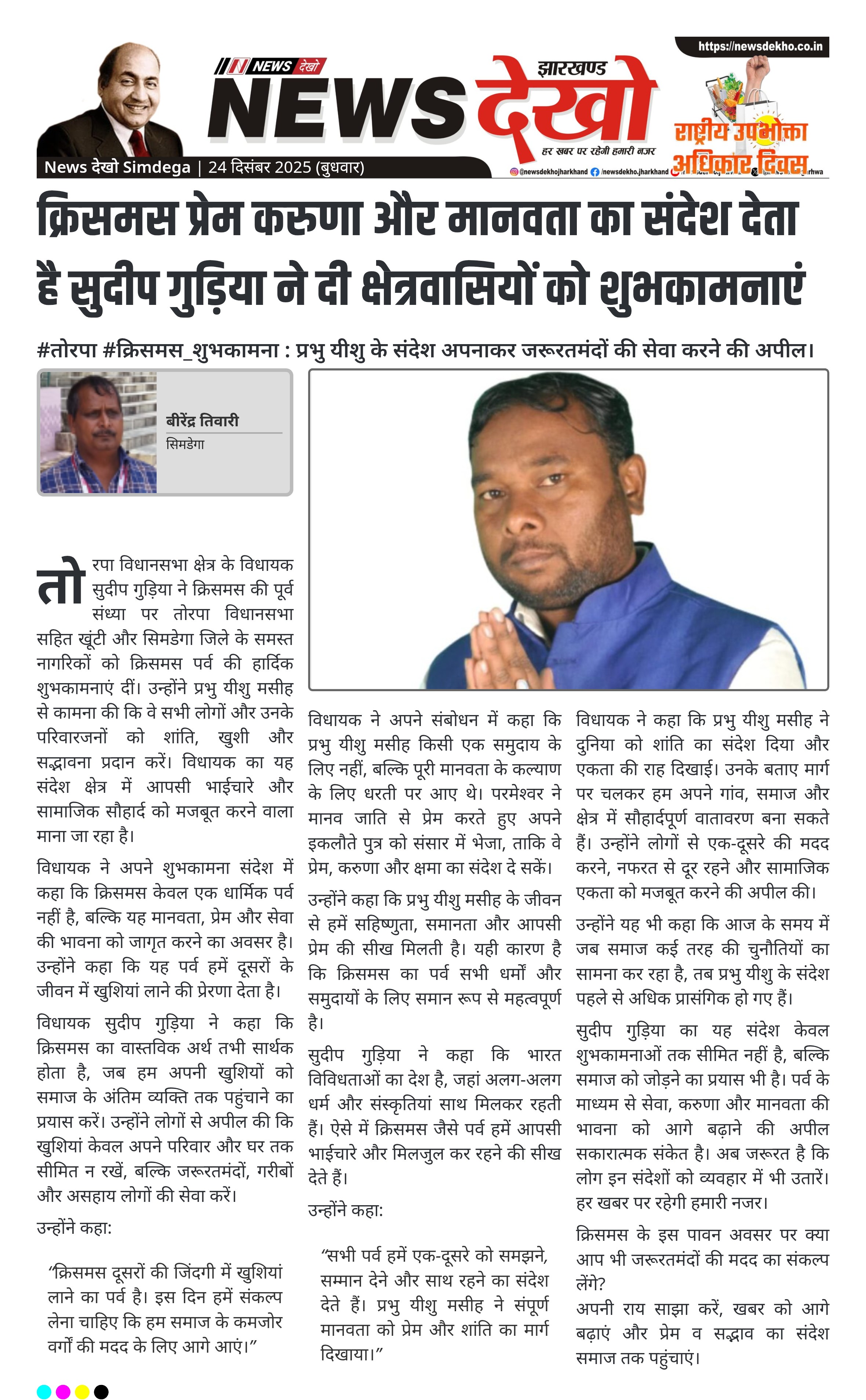 #तोरपा #क्रिसमस_शुभकामना : प्रभु यीशु के संदेश अपनाकर जरूरतमंदों की सेवा करने की अपील। तोरपा विधायक सुदीप गुड़िया ने क्रिसमस की पूर्व संध्या पर दी शुभकामनाएं। खूंटी और सिमडेगा जिले के नागरिकों के लिए विशेष संदेश। क्रिसमस को प्रेम, करुणा और सेवा का पर्व बताया। प्रभु यीशु मसीह के मानवता के संदेश अपनाने पर जोर। जरूरतमंदों की मदद और सामाजिक एकता की अपील। तोरपा विधानसभा क्षेत्र के विधायक सुदीप गुड़िया ने क्रिसमस की पूर्व संध्या पर तोरपा विधानसभा सहित खूंटी…