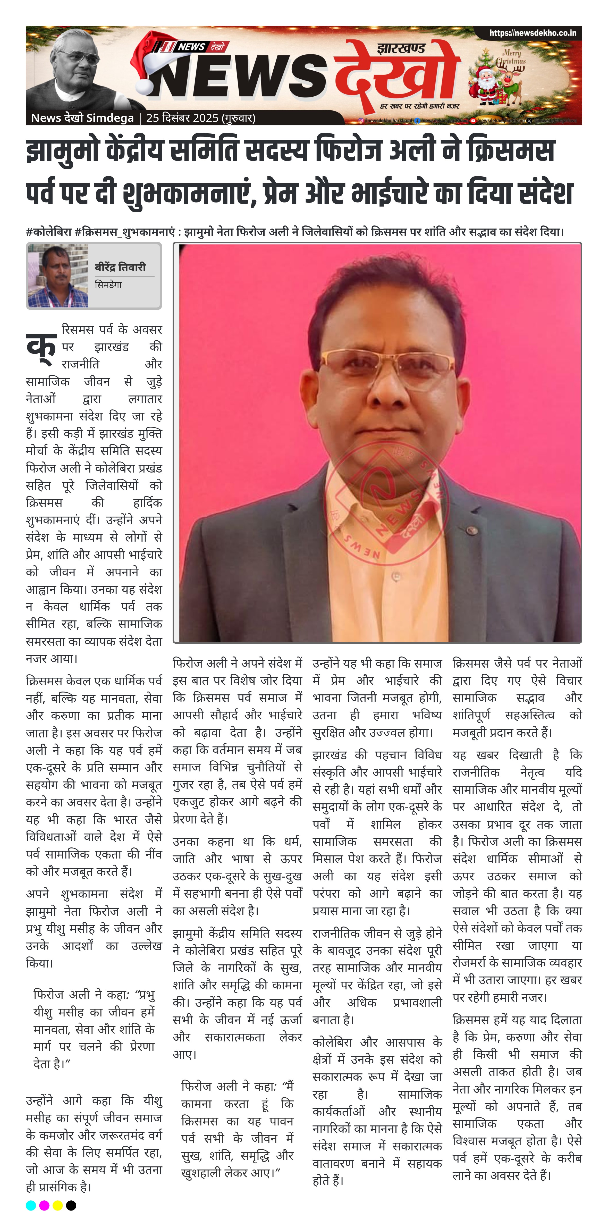 झामुमो केंद्रीय समिति सदस्य फिरोज अली ने क्रिसमस पर्व पर दी शुभकामनाएं, प्रेम और भाईचारे का दिया संदेश