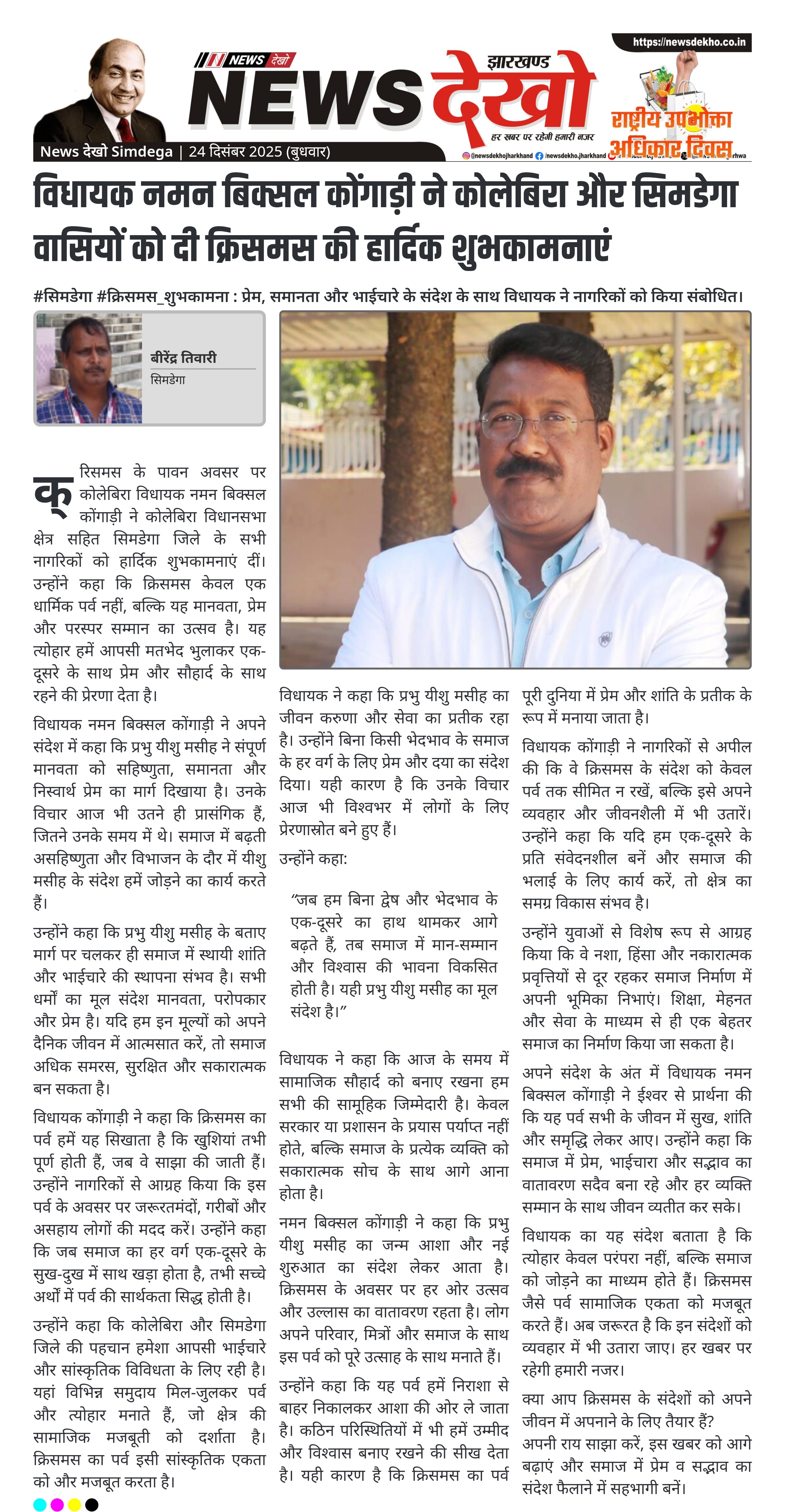 विधायक नमन बिक्सल कोंगाड़ी ने कोलेबिरा और सिमडेगा वासियों को दी क्रिसमस की हार्दिक शुभकामनाएं