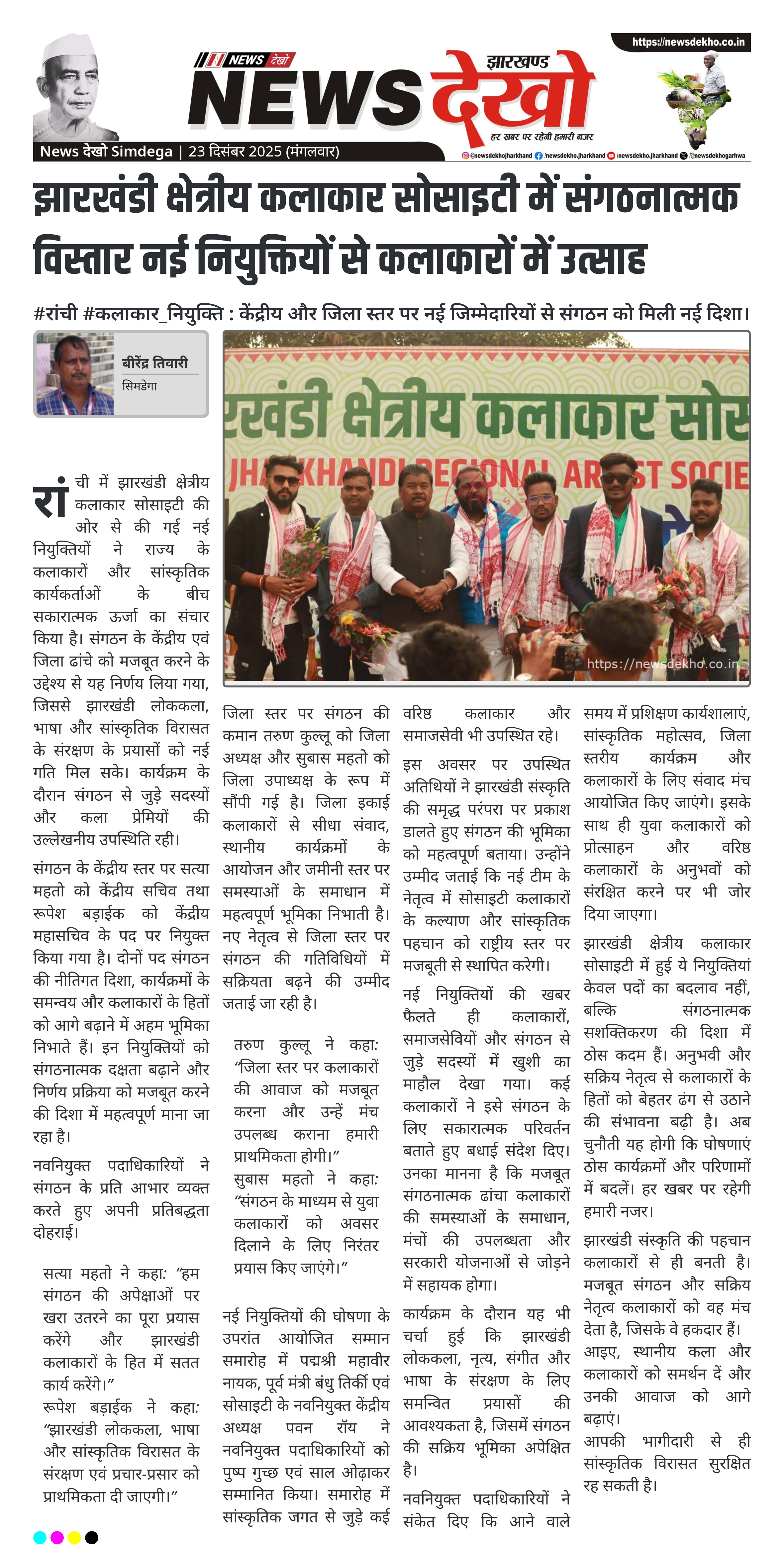 #रांची #कलाकार_नियुक्ति : केंद्रीय और जिला स्तर पर नई जिम्मेदारियों से संगठन को मिली नई दिशा। झारखंडी क्षेत्रीय कलाकार सोसाइटी में केंद्रीय व जिला स्तर पर नई नियुक्तियां। सत्या महतो केंद्रीय सचिव और रूपेश बड़ाईक केंद्रीय महासचिव नियुक्त। जिला स्तर पर तरुण कुल्लू बने जिला अध्यक्ष, सुबास महतो जिला उपाध्यक्ष। पद्मश्री महावीर नायक, बंधु तिर्की और पवन रॉय ने किया सम्मान। कलाकारों और समाजसेवियों में नई टीम को लेकर उत्साह। रांची में झारखंडी क्षेत्रीय कलाकार सोसाइटी की ओर से की…