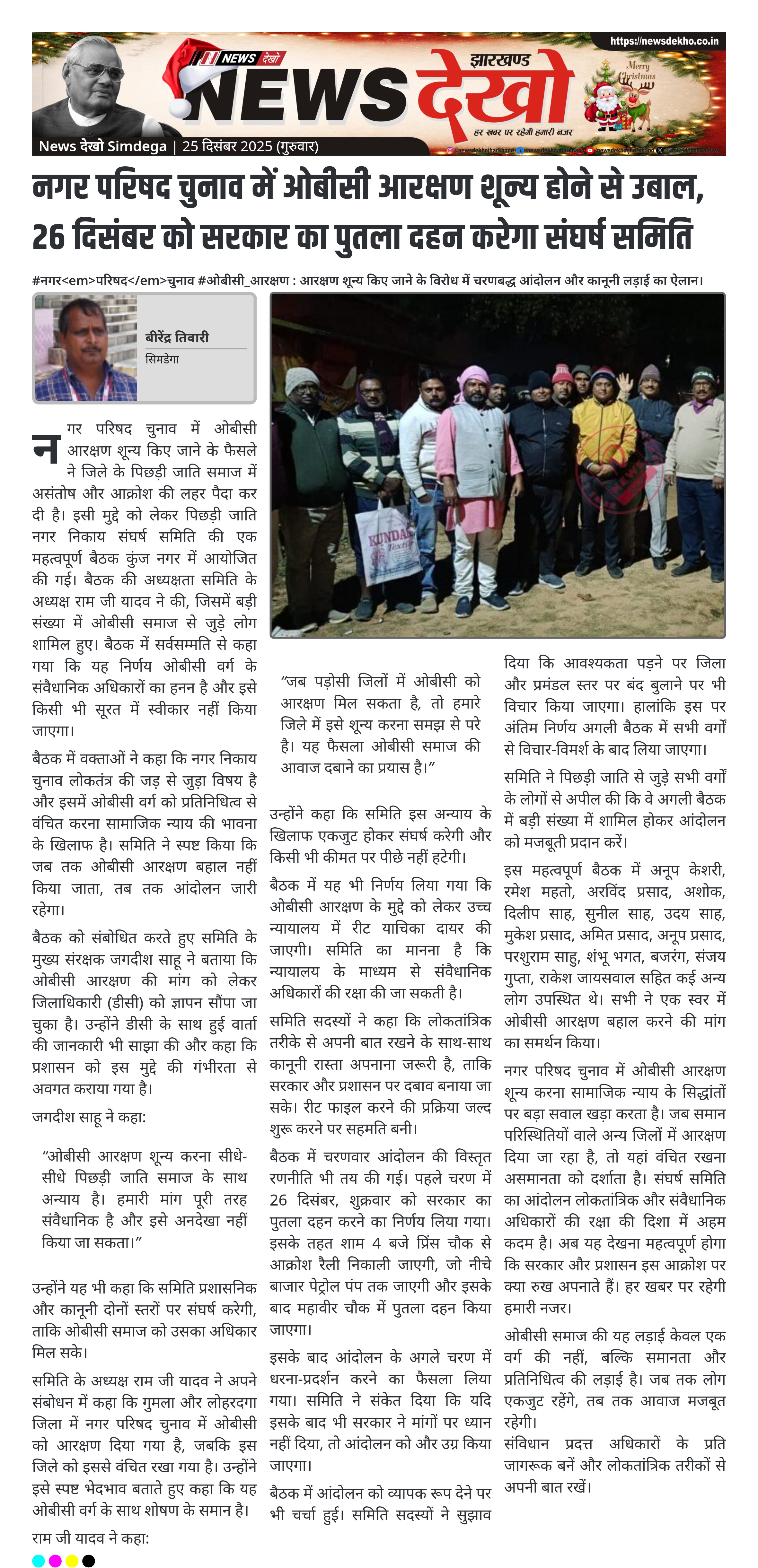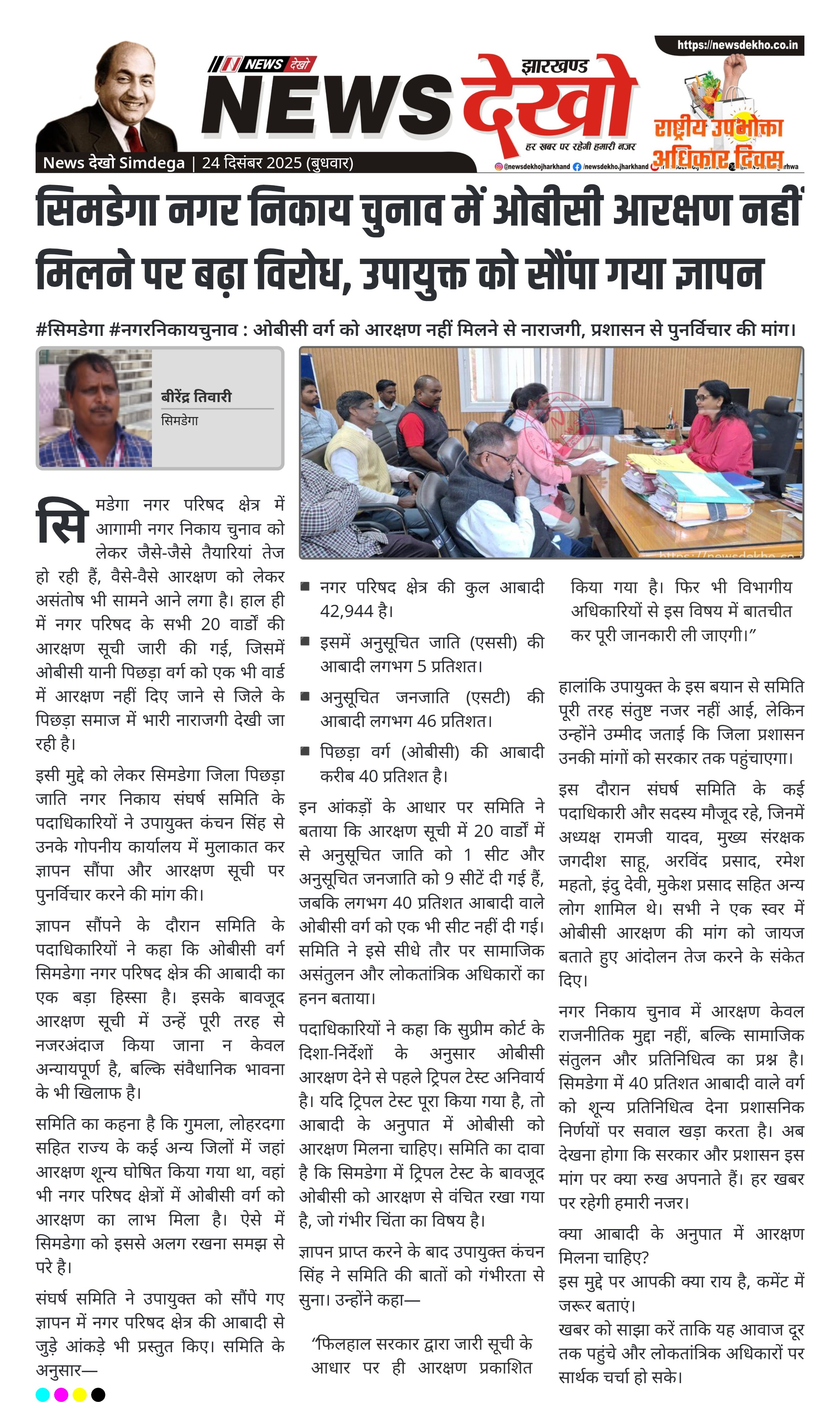 #सिमडेगा #नगरनिकायचुनाव : ओबीसी वर्ग को आरक्षण नहीं मिलने से नाराजगी, प्रशासन से पुनर्विचार की मांग। सिमडेगा नगर परिषद के सभी 20 वार्डों की आरक्षण सूची जारी। ओबीसी वर्ग को एक भी वार्ड में आरक्षण नहीं मिलने पर विरोध। जिला पिछड़ा जाति नगर निकाय संघर्ष समिति ने सौंपा ज्ञापन। ओबीसी आबादी लगभग 40 प्रतिशत, फिर भी शून्य प्रतिनिधित्व। उपायुक्त कंचन सिंह ने विभाग से जानकारी लेने का दिया आश्वासन। सिमडेगा नगर परिषद क्षेत्र में आगामी नगर निकाय चुनाव को लेकर…