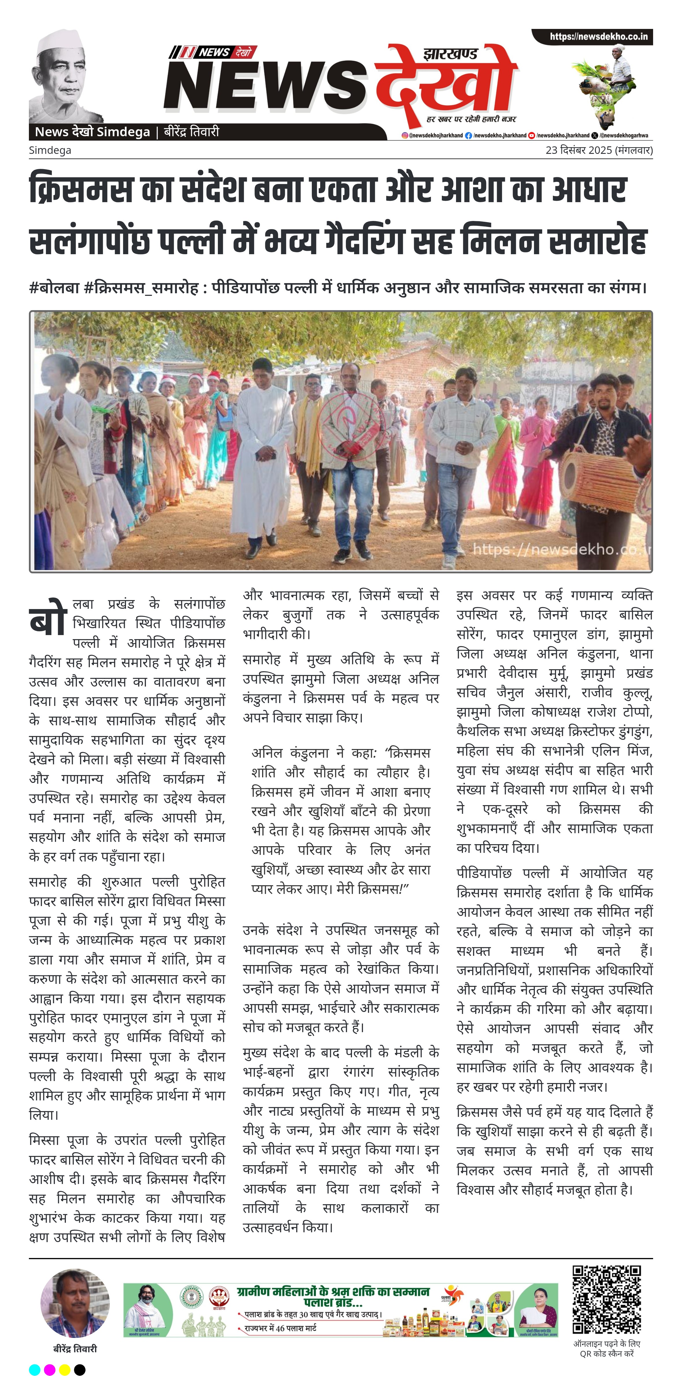 #बोलबा #क्रिसमस_समारोह : पीडियापोंछ पल्ली में धार्मिक अनुष्ठान और सामाजिक समरसता का संगम। पीडियापोंछ पल्ली, सलंगापोंछ भिखारियत में क्रिसमस गैदरिंग सह मिलन समारोह आयोजित। फादर बासिल सोरेंग द्वारा मिस्सा पूजा संपन्न, फादर एमानुएल डांग का सहयोग। मुख्य अतिथि झामुमो जिला अध्यक्ष अनिल कंडुलना ने दिया शांति और आशा का संदेश। चरनी की विधिवत आशीष के बाद केक काटकर समारोह का शुभारंभ। सांस्कृतिक कार्यक्रमों में पल्ली के मंडली भाई-बहनों की सक्रिय भागीदारी। बोलबा प्रखंड के सलंगापोंछ भिखारियत स्थित पीडियापोंछ पल्ली में…