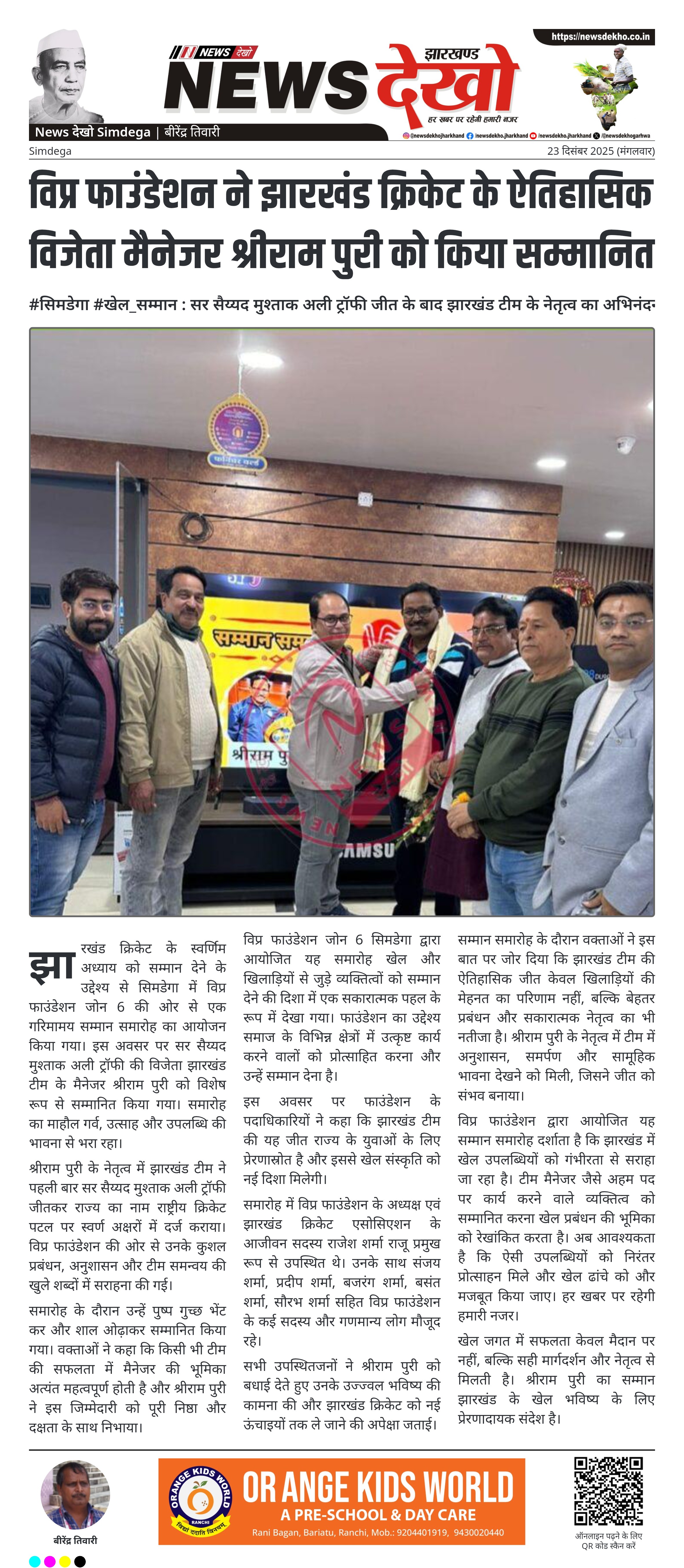 #सिमडेगा #खेल_सम्मान : सर सैय्यद मुश्ताक अली ट्रॉफी जीत के बाद झारखंड टीम के नेतृत्व का अभिनंदन। विप्र फाउंडेशन जोन 6 सिमडेगा द्वारा सम्मान समारोह का आयोजन। श्रीराम पुरी, झारखंड टीम के मैनेजर को किया गया सम्मानित। सर सैय्यद मुश्ताक अली ट्रॉफी में पहली बार झारखंड की ऐतिहासिक जीत। पुष्प गुच्छ और शाल ओढ़ाकर किया गया अभिनंदन। राजेश शर्मा राजू सहित कई पदाधिकारी और सदस्य रहे उपस्थित। झारखंड क्रिकेट के स्वर्णिम अध्याय को सम्मान देने के उद्देश्य से सिमडेगा में…