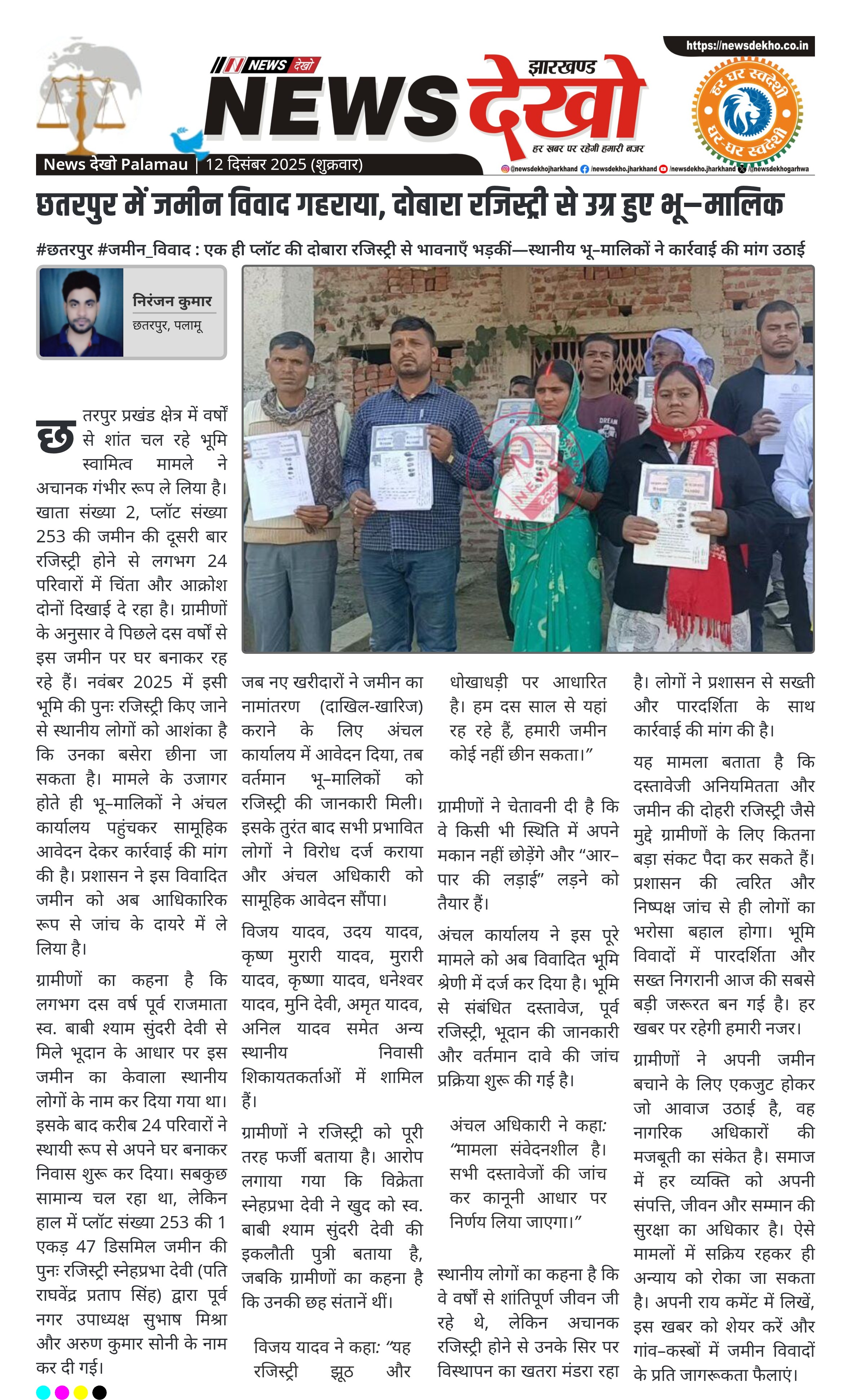 #छतरपुर #जमीन_विवाद : एक ही प्लॉट की दोबारा रजिस्ट्री से भावनाएँ भड़कीं—स्थानीय भू–मालिकों ने कार्रवाई की मांग उठाई छतरपुर मौजा के खाता संख्या 2, प्लॉट 253 पर दोबारा रजिस्ट्री से विवाद बढ़ा। लगभग 24 परिवार पिछले दस वर्षों से जमीन पर रह रहे हैं। नवंबर 2025 में जमीन की पुनः रजिस्ट्री स्नेहप्रभा देवी द्वारा कराए जाने का आरोप। प्रभावित भू–मालिकों ने अंचल कार्यालय में सामूहिक आपत्ति दर्ज कराई। ग्रामीणों ने जमीन न छोड़ने की चेतावनी देते हुए कहा—“जान भी जाए…