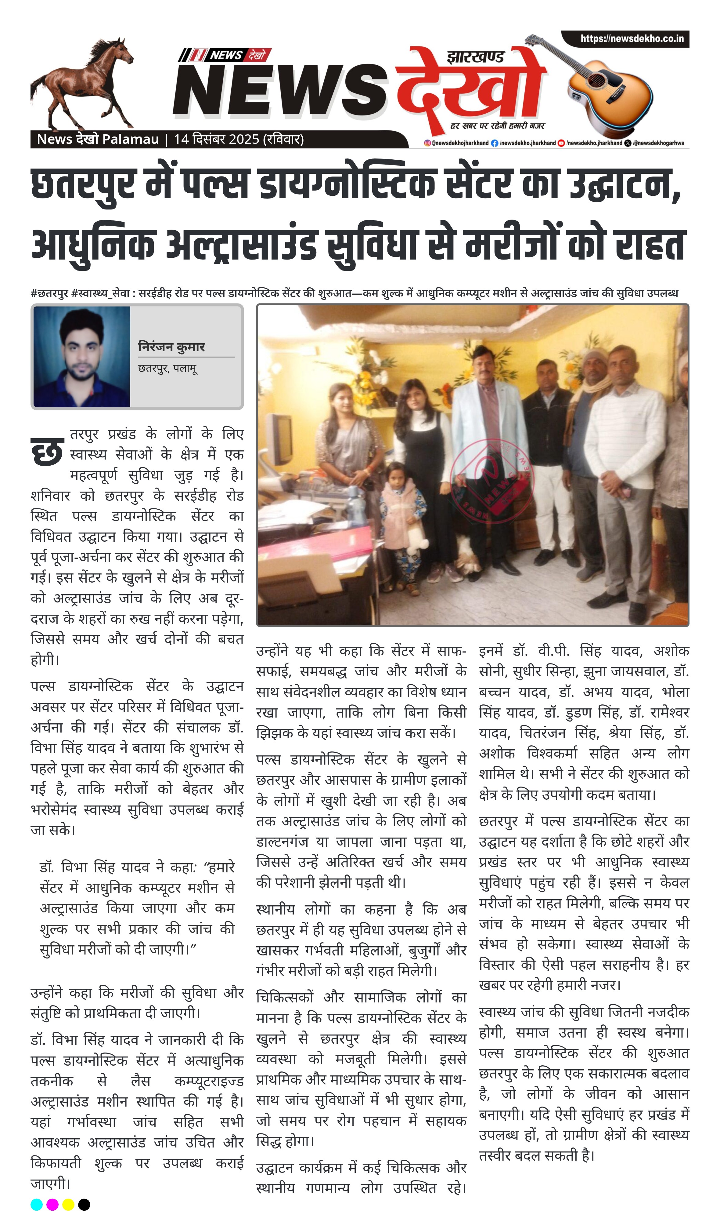#छतरपुर #स्वास्थ्य_सेवा : सरईडीह रोड पर पल्स डायग्नोस्टिक सेंटर की शुरुआत—कम शुल्क में आधुनिक कम्प्यूटर मशीन से अल्ट्रासाउंड जांच की सुविधा उपलब्ध छतरपुर सरईडीह रोड स्थित पल्स डायग्नोस्टिक सेंटर का विधिवत उद्घाटन। उद्घाटन से पूर्व पूजा-अर्चना के साथ सेंटर की शुरुआत। डॉ. विभा सिंह यादव ने कम शुल्क में सभी प्रकार के अल्ट्रासाउंड की जानकारी दी। आधुनिक कम्प्यूटराइज्ड मशीन से जांच की सुविधा। अब मरीजों को डाल्टनगंज और जापला नहीं जाना पड़ेगा। उद्घाटन अवसर पर कई चिकित्सक और गणमान्य लोग…