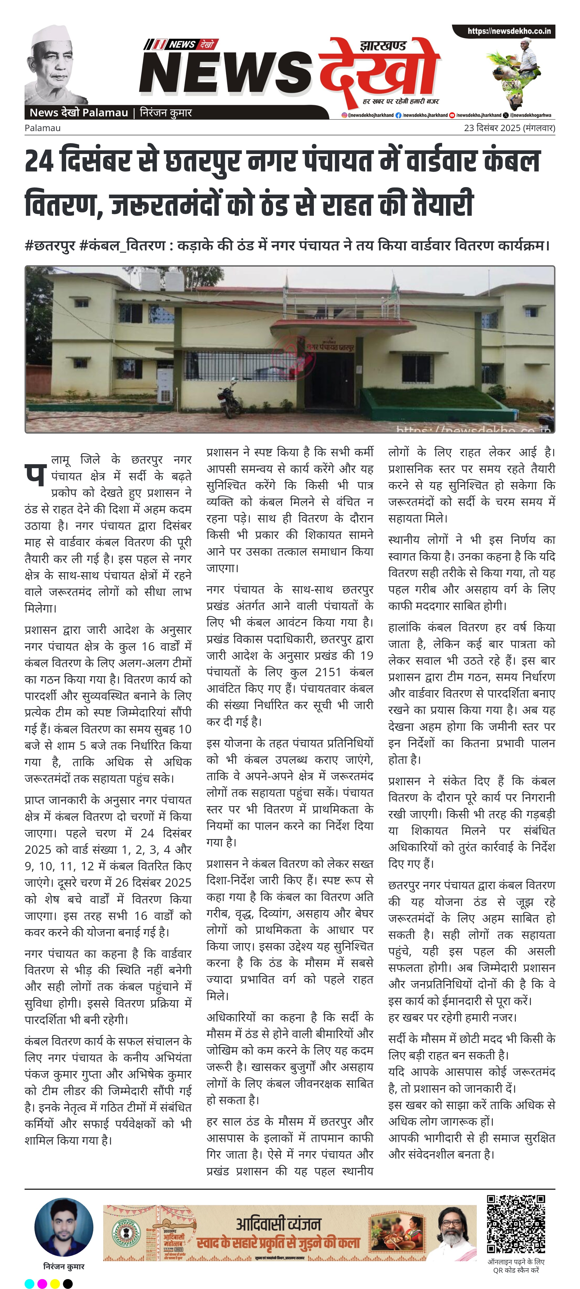 #छतरपुर #कंबल_वितरण : कड़ाके की ठंड में नगर पंचायत ने तय किया वार्डवार वितरण कार्यक्रम। छतरपुर नगर पंचायत के 16 वार्डों में होगा कंबल वितरण। 24 और 26 दिसंबर 2025 को सुबह 10 से शाम 5 बजे तक वितरण। कनीय अभियंता पंकज कुमार गुप्ता और अभिषेक कुमार बने टीम लीडर। 19 पंचायतों के लिए 2151 कंबल किए गए आवंटित। अति गरीब, वृद्ध, दिव्यांग व असहाय को प्राथमिकता के निर्देश। पलामू जिले के छतरपुर नगर पंचायत क्षेत्र में सर्दी के बढ़ते…