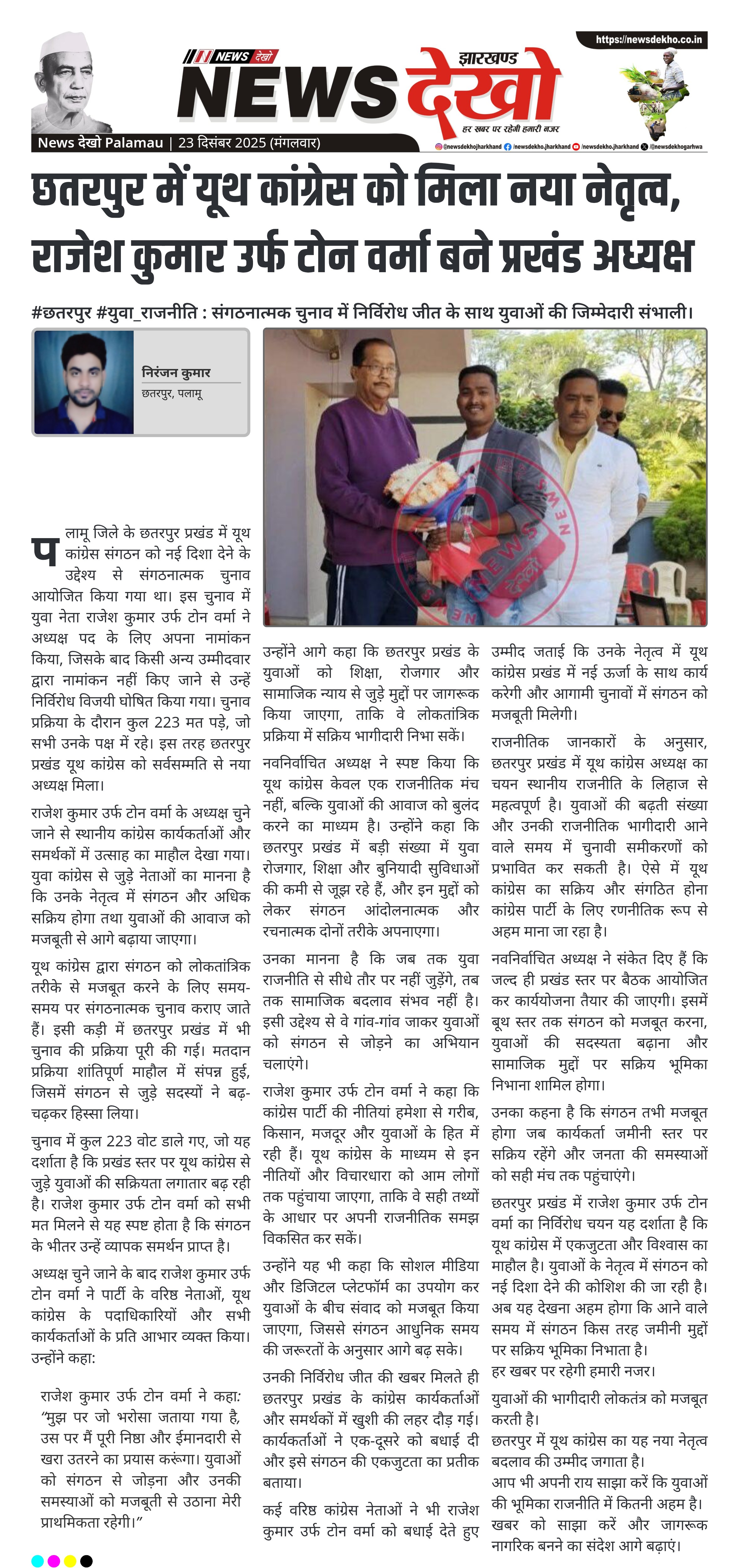 छतरपुर में यूथ कांग्रेस को मिला नया नेतृत्व, राजेश कुमार उर्फ टोन वर्मा बने प्रखंड अध्यक्ष
