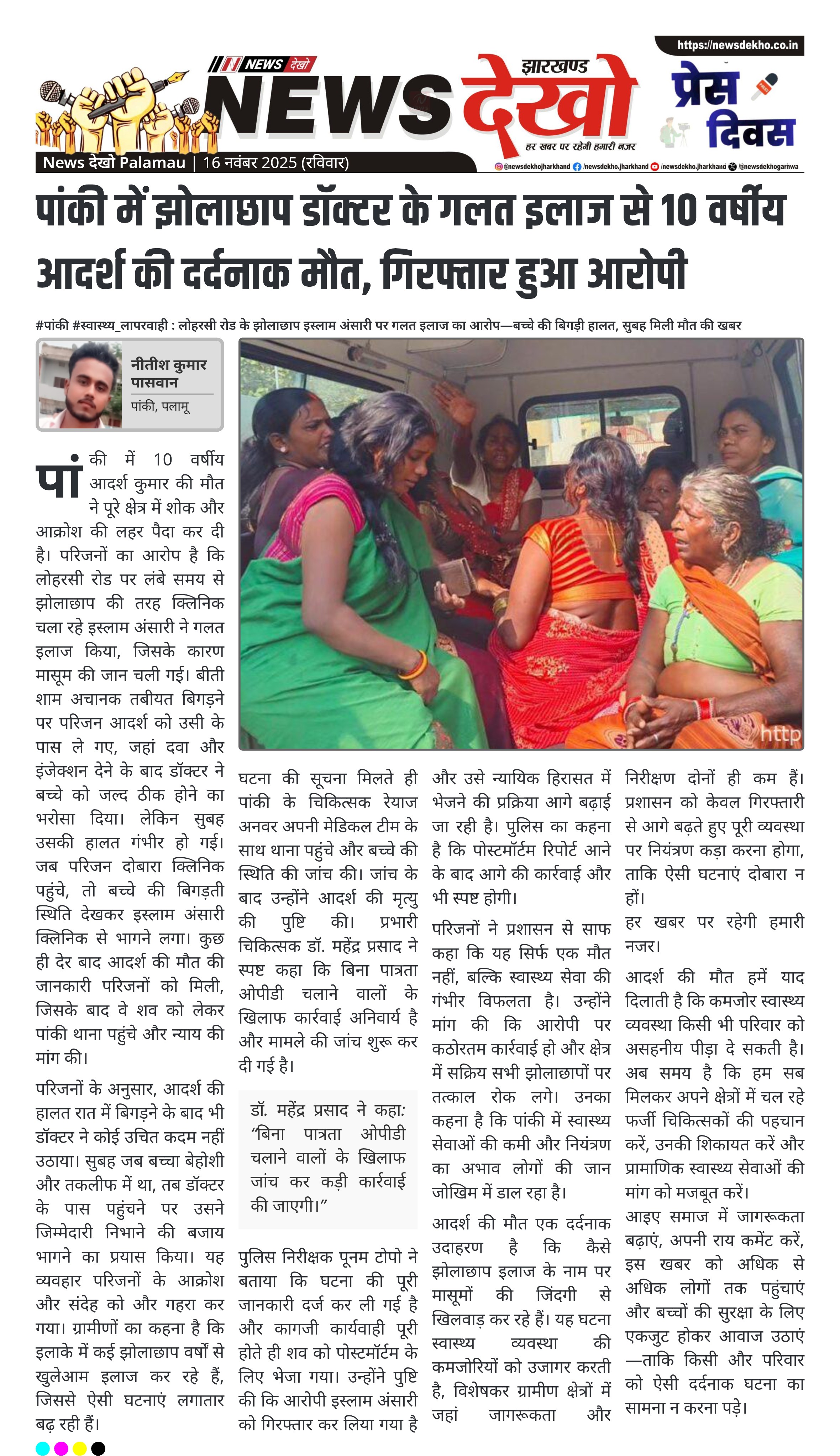 #पांकी #स्वास्थ्य_लापरवाही : लोहरसी रोड के झोलाछाप इस्लाम अंसारी पर गलत इलाज का आरोप—बच्चे की बिगड़ी हालत, सुबह मिली मौत की खबर 10 वर्षीय आदर्श कुमार की संदिग्ध परिस्थितियों में मौत। लोहरसी रोड के झोलाछाप इस्लाम अंसारी पर गलत इलाज का आरोप। शाम को दिया गया दवा व इंजेक्शन, सुबह हालत बिगड़ी। क्लिनिक पहुंचते ही डॉक्टर बच्चे की गंभीर हालत देखकर भागने लगा। चिकित्सक रेयाज अनवर और उनकी टीम ने मौके पर पहुंचकर मृत्यु की पुष्टि की। डॉ. महेंद्र प्रसाद…