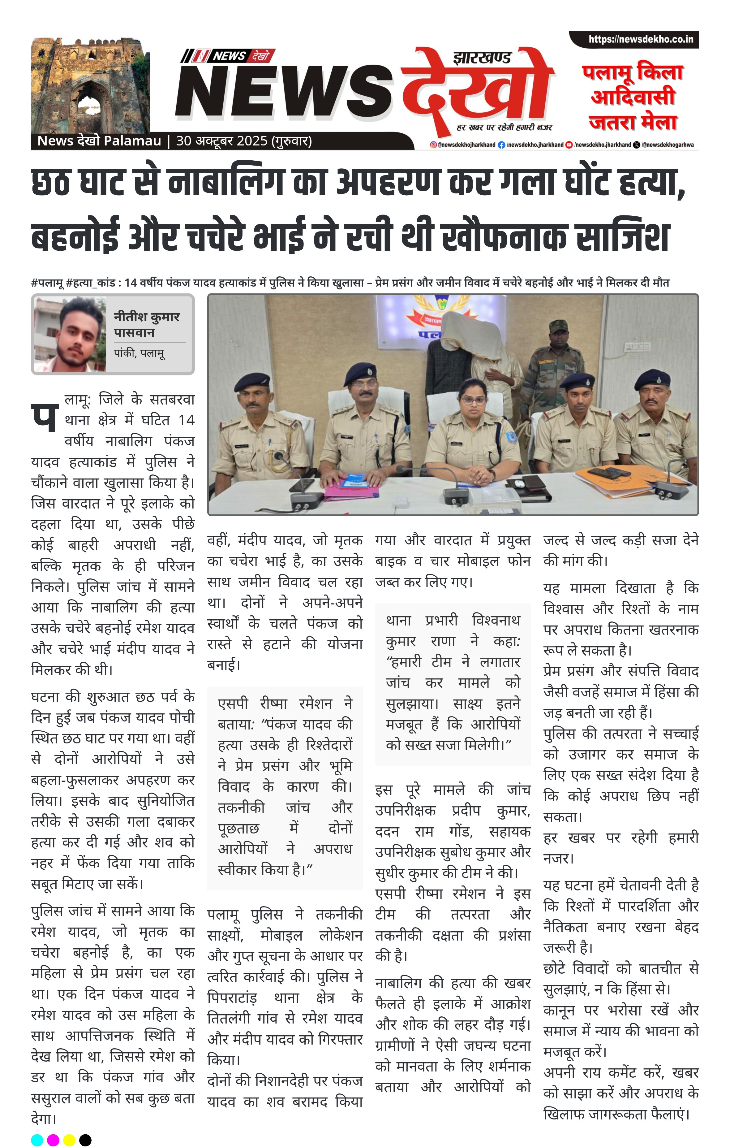 #पलामू #हत्या_कांड : 14 वर्षीय पंकज यादव हत्याकांड में पुलिस ने किया खुलासा – प्रेम प्रसंग और जमीन विवाद में चचेरे बहनोई और भाई ने मिलकर दी मौत सतबरवा थाना क्षेत्र में 14 वर्षीय पंकज यादव की गला दबाकर हत्या का सनसनीखेज मामला उजागर। पुलिस ने चचेरे बहनोई रमेश यादव और चचेरे भाई मंदीप यादव को गिरफ्तार किया। हत्या का कारण प्रेम प्रसंग और भूमि विवाद, दोनों ने मिलकर बनाई थी साजिश। छठ घाट से अपहरण के बाद नहर में…