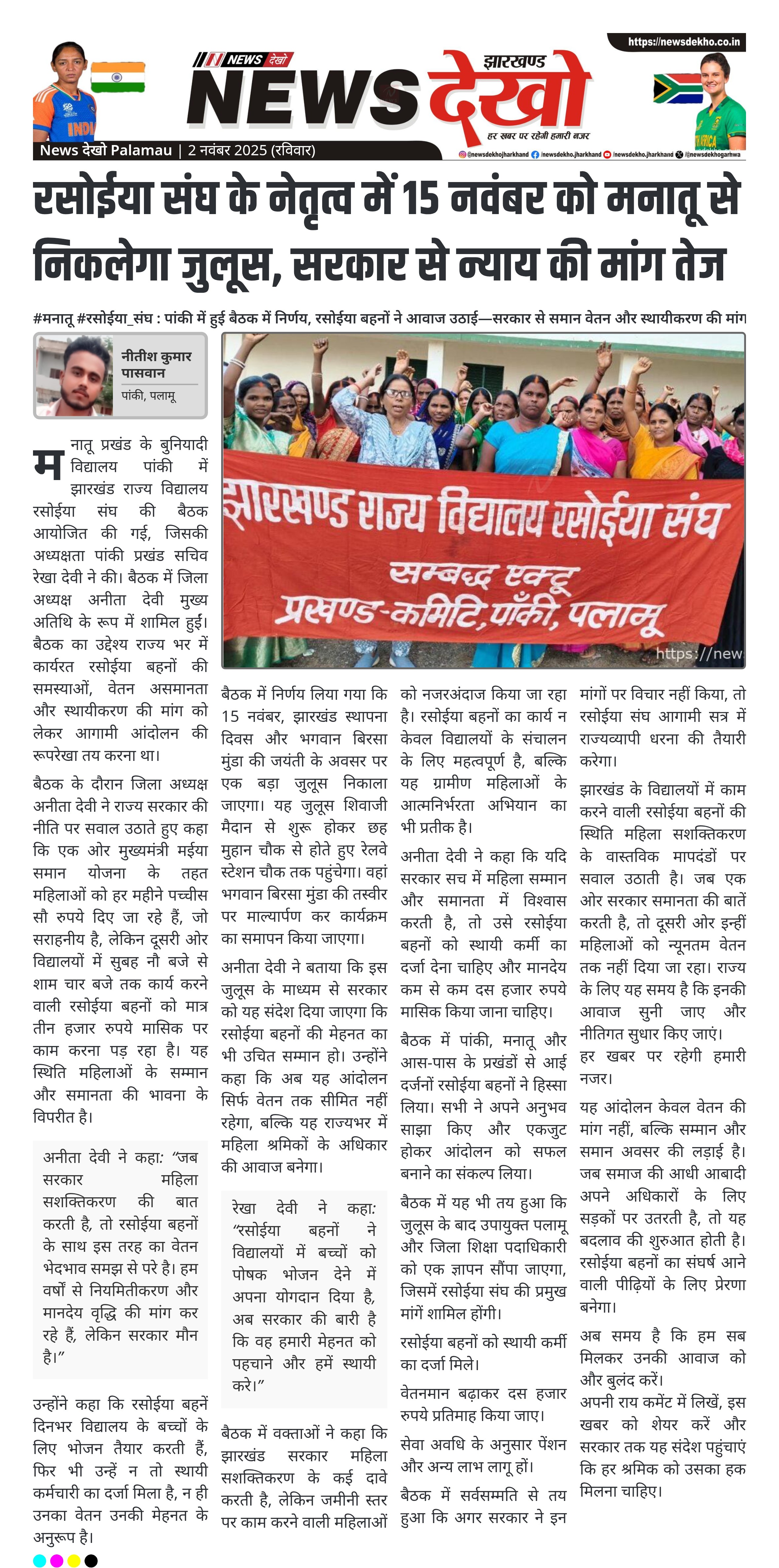 #मनातू #रसोईया_संघ : पांकी में हुई बैठक में निर्णय, रसोईया बहनों ने आवाज उठाई—सरकार से समान वेतन और स्थायीकरण की मांग बुनियादी विद्यालय पांकी में झारखंड राज्य विद्यालय रसोईया संघ की बैठक संपन्न हुई। बैठक की अध्यक्षता पांकी प्रखंड सचिव रेखा देवी ने की। जिला अध्यक्ष अनीता देवी रहीं मुख्य अतिथि, आंदोलन की रूपरेखा पर चर्चा हुई। 15 नवंबर को मनातू में रसोईया बहनों का विशाल जुलूस निकलेगा। बिरसा मुंडा की जयंती पर रेलवे स्टेशन चौक पर माल्यार्पण कार्यक्रम होगा।…