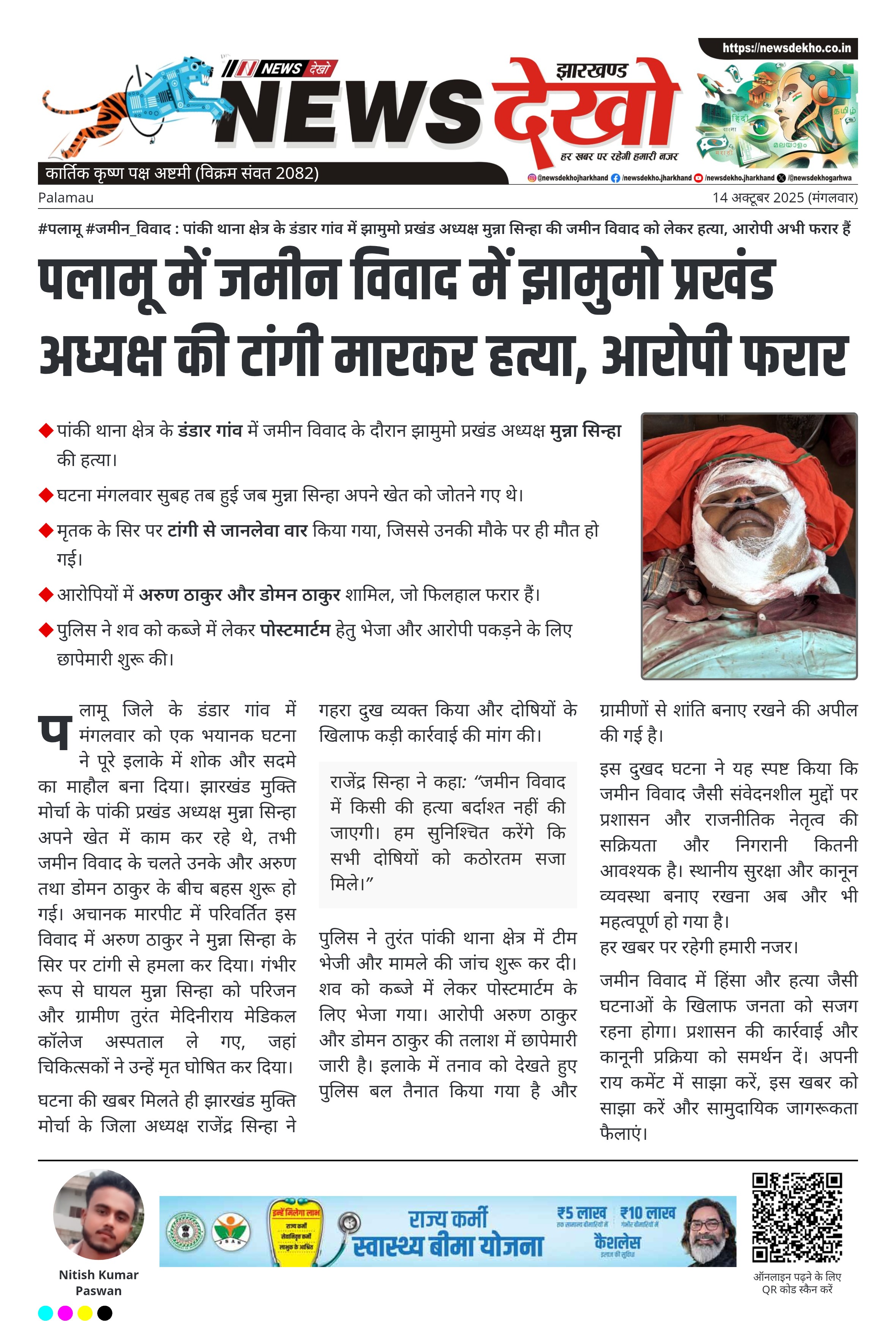 #पलामू #जमीन_विवाद : पांकी थाना क्षेत्र के डंडार गांव में झामुमो प्रखंड अध्यक्ष मुन्ना सिन्हा की जमीन विवाद को लेकर हत्या, आरोपी अभी फरार हैं पांकी थाना क्षेत्र के डंडार गांव में जमीन विवाद के दौरान झामुमो प्रखंड अध्यक्ष मुन्ना सिन्हा की हत्या। घटना मंगलवार सुबह तब हुई जब मुन्ना सिन्हा अपने खेत को जोतने गए थे। मृतक के सिर पर टांगी से जानलेवा वार किया गया, जिससे उनकी मौके पर ही मौत हो गई। आरोपियों में अरुण ठाकुर और…