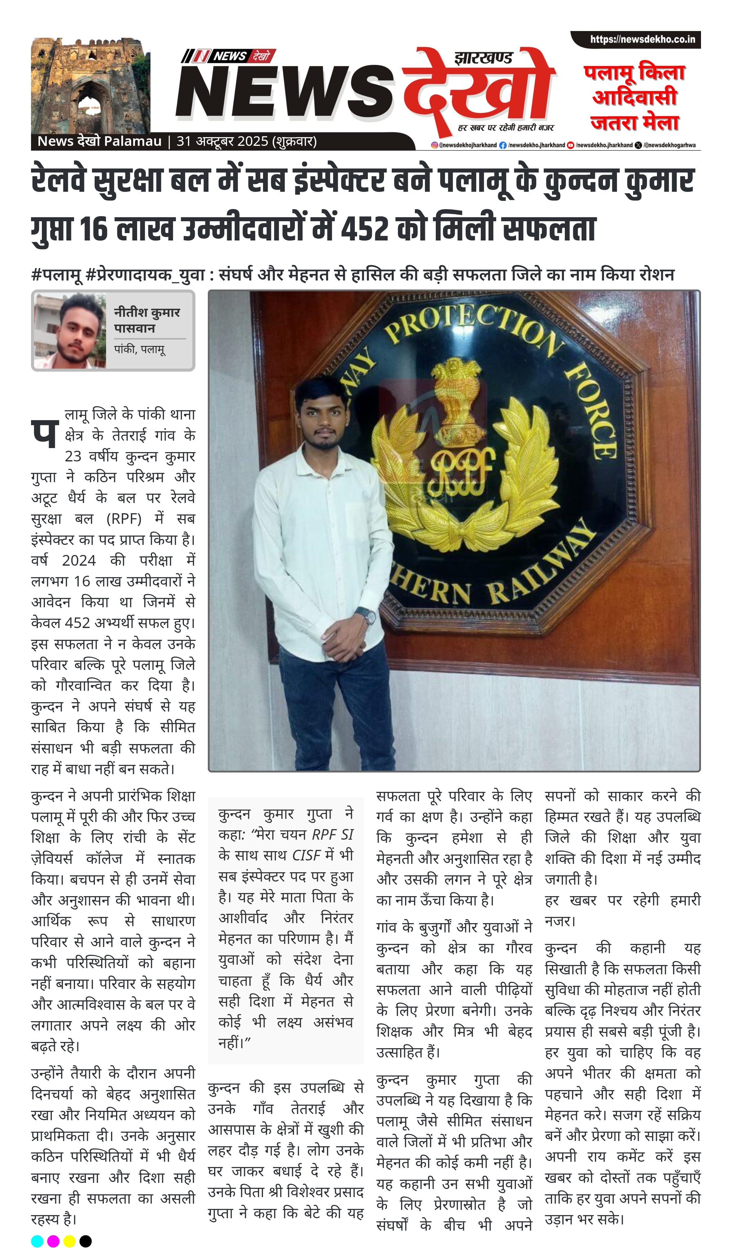 रेलवे सुरक्षा बल में सब इंस्पेक्टर बने पलामू के कुन्दन कुमार गुप्ता 16 लाख उम्मीदवारों में 452 को मिली सफलता
