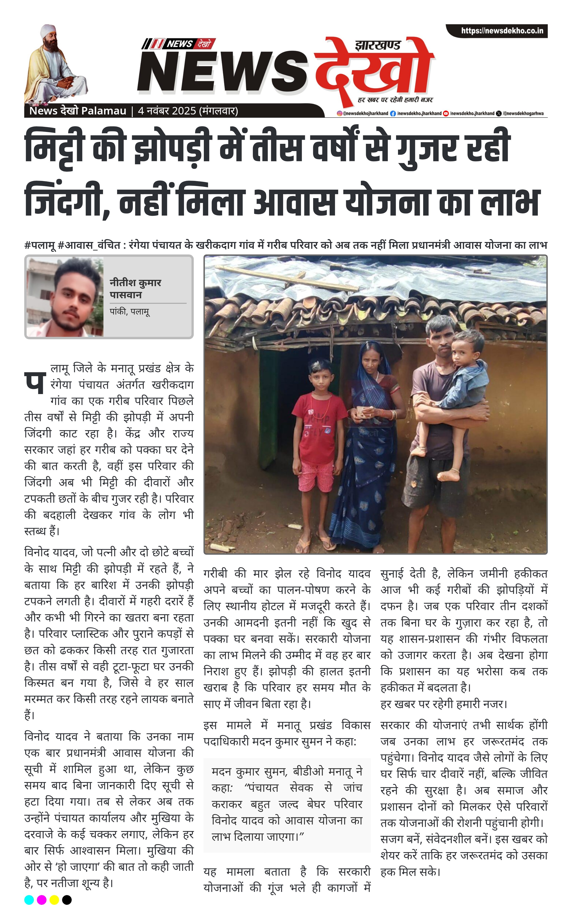#पलामू #आवास_वंचित : रंगेया पंचायत के खरीकदाग गांव में गरीब परिवार को अब तक नहीं मिला प्रधानमंत्री आवास योजना का लाभ। मनातू प्रखंड क्षेत्र के खरीकदाग गांव में 30 वर्षों से मिट्टी की झोपड़ी में रह रहा है एक गरीब परिवार। विनोद यादव पत्नी और दो बच्चों के साथ झोपड़ी में रहने को मजबूर। बरसात में टपकती छत और दरारों वाली दीवारों में जिंदगी बिता रहा परिवार। प्रधानमंत्री आवास योजना की सूची से नाम हटा, बार-बार आवेदन के बावजूद अब…