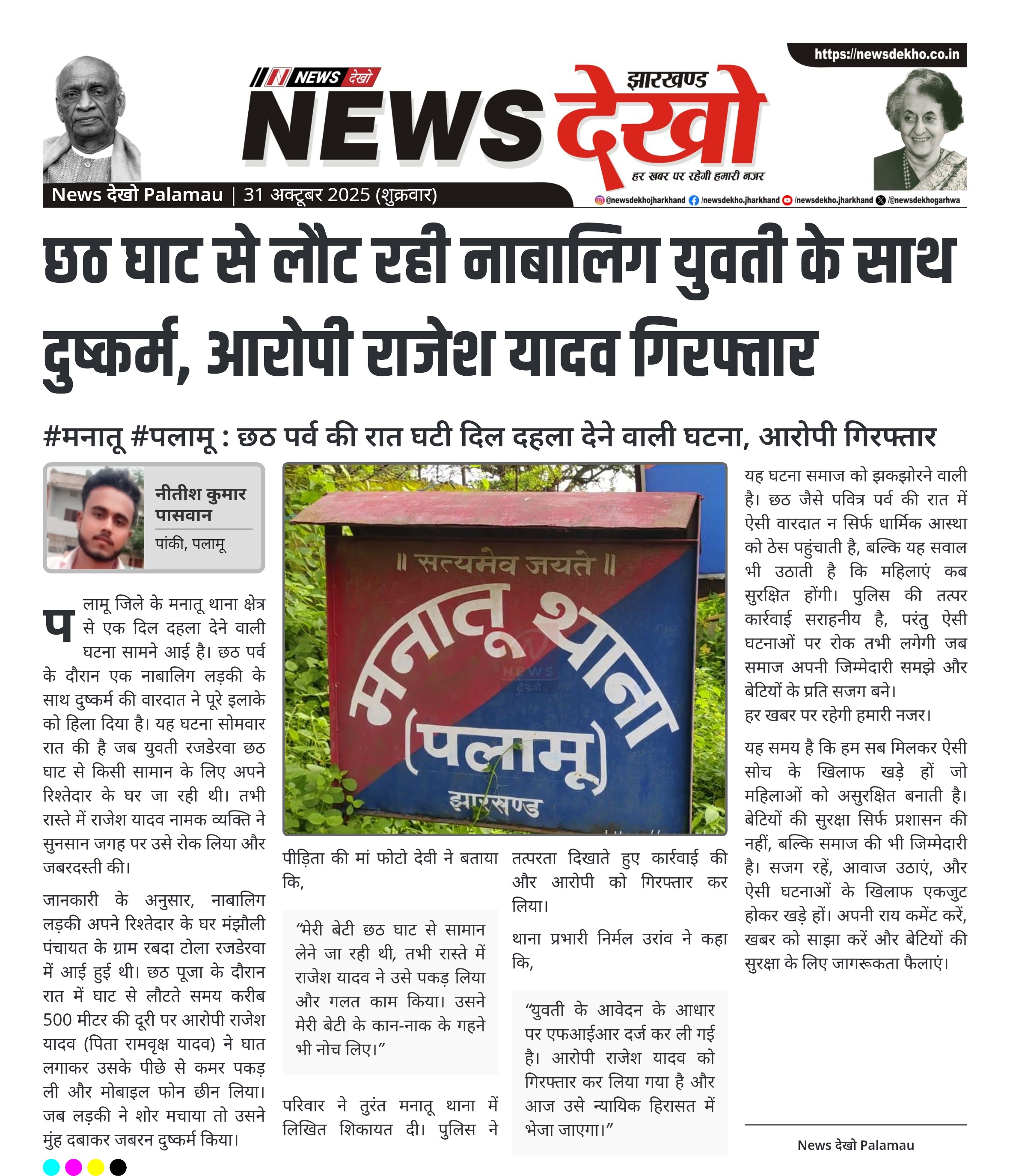 #मनातू #पलामू : छठ पर्व की रात घटी दिल दहला देने वाली घटना, आरोपी गिरफ्तार मनातू थाना क्षेत्र के रबदा टोला रजडेरवा गांव में नाबालिग के साथ दुष्कर्म की वारदात। आरोपी राजेश यादव (40 वर्ष) ने छठ घाट से लौट रही लड़की को बनाया निशाना। पीड़िता की मां फोटो देवी ने पुलिस को दी लिखित शिकायत। आरोपी ने मोबाइल और जेवर छीनकर, मुंह दबाकर किया दुष्कर्म। थाना प्रभारी निर्मल उरांव ने बताया – आरोपी गिरफ्तार, न्यायिक हिरासत में भेजा जाएगा।…