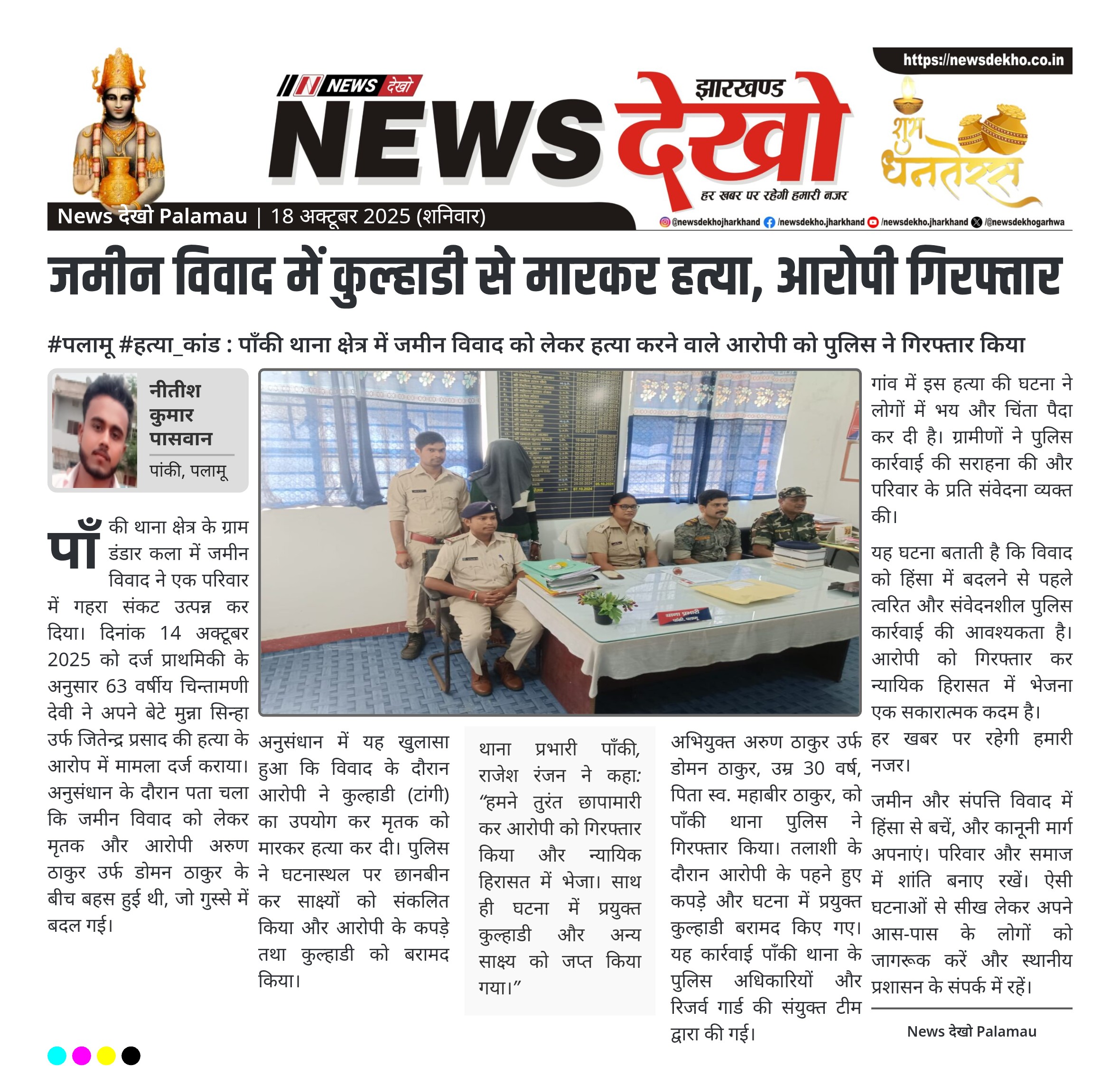 #पलामू #हत्या_कांड : पाँकी थाना क्षेत्र में जमीन विवाद को लेकर हत्या करने वाले आरोपी को पुलिस ने गिरफ्तार किया पाँकी थाना कांड सं. 125/2025 दिनांक 14.10.2025 में हत्या का मामला दर्ज। आरोपी अरुण ठाकुर उर्फ डोमन ठाकुर को गिरफ्तार कर न्यायिक हिरासत में भेजा गया। मृतक मुन्ना सिन्हा उर्फ जितेन्द्र प्रसाद था। घटना में प्रयुक्त कुल्हाडी और अभियुक्त के कपड़े बरामद। कार्रवाई में पाँकी थाना पुलिस और रिजर्व गार्ड शामिल। पाँकी थाना क्षेत्र के ग्राम डंडार कला में जमीन…