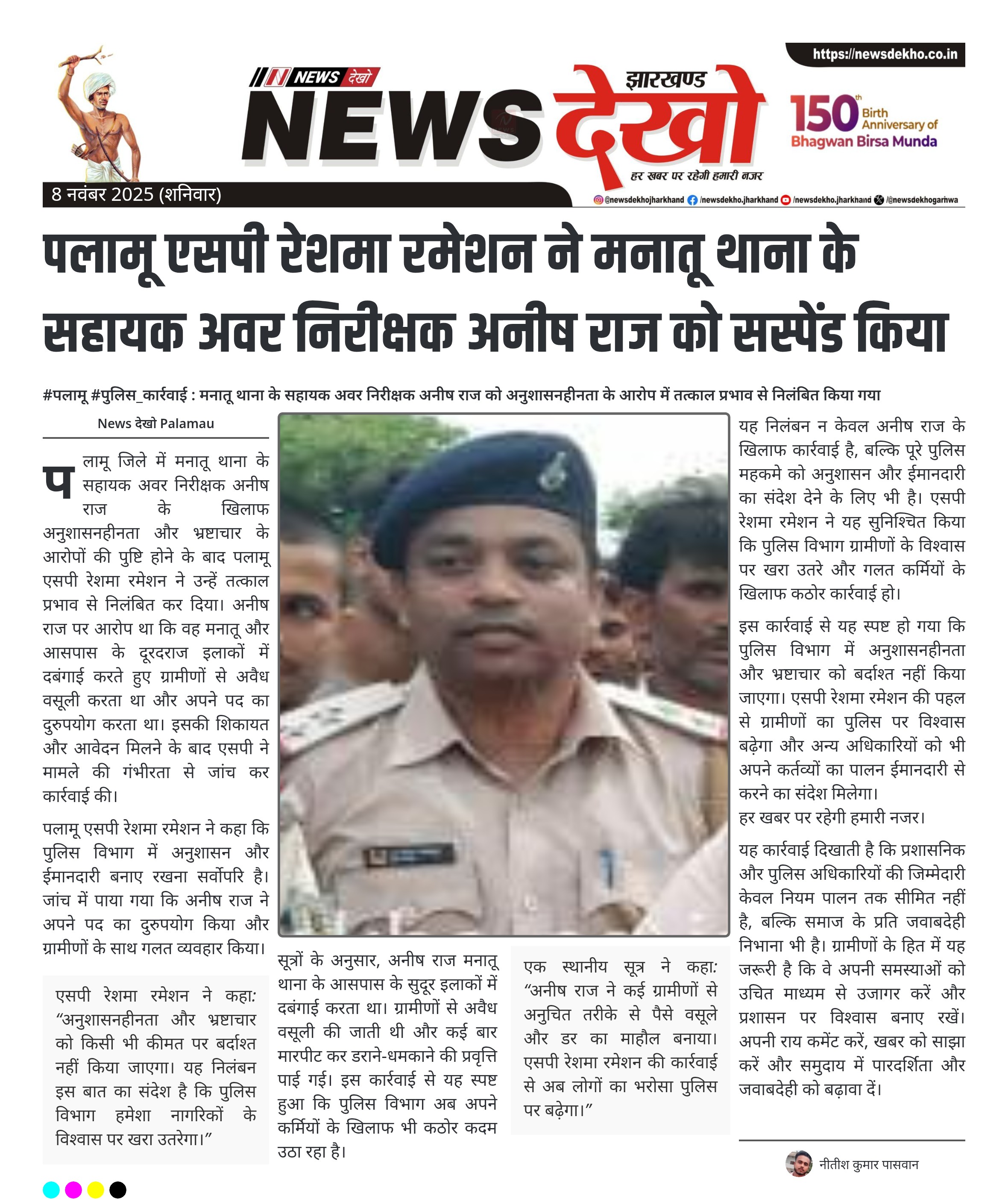 पलामू एसपी रेशमा रमेशन ने मनातू थाना के सहायक अवर निरीक्षक अनीष राज को सस्पेंड किया