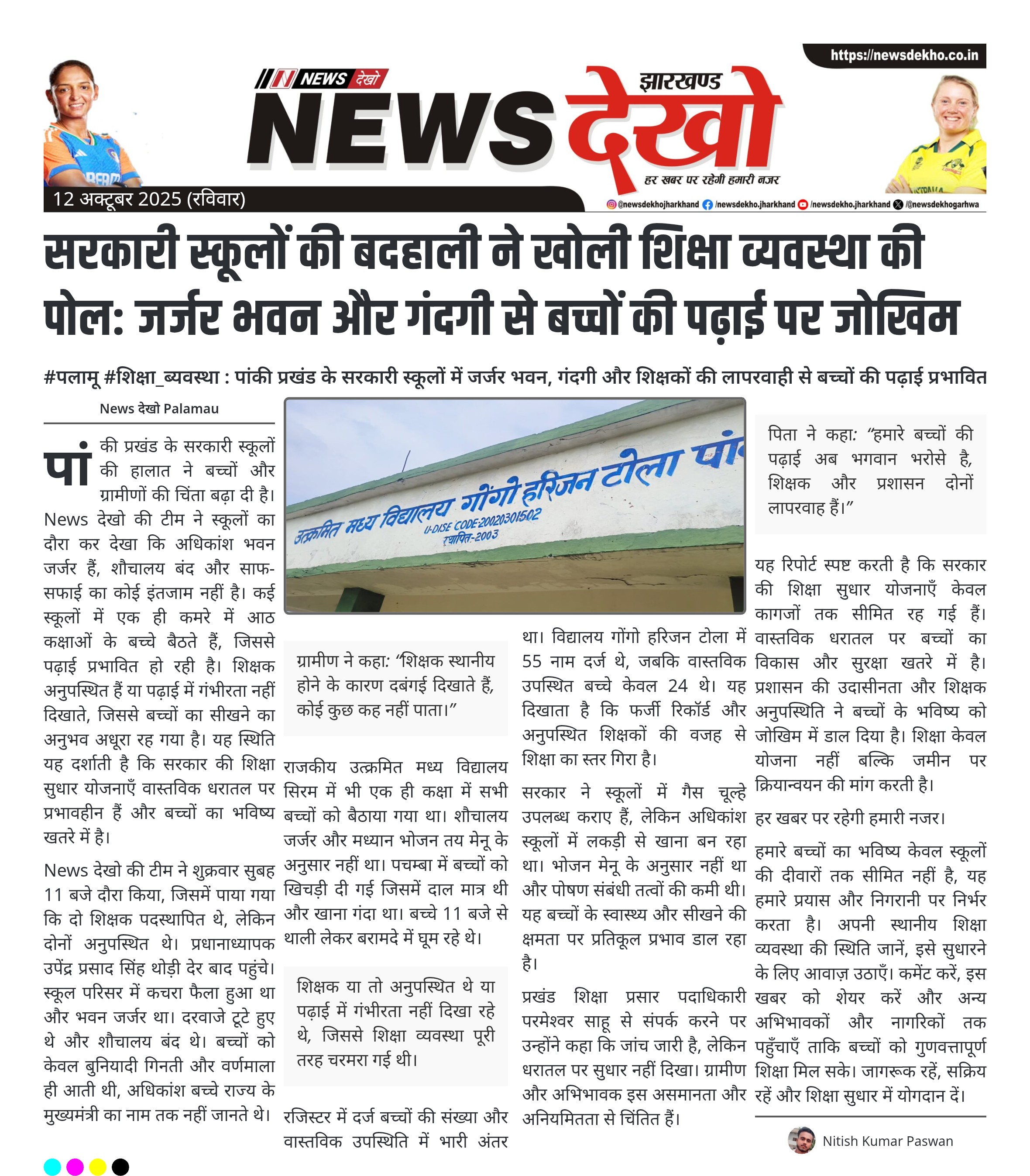 #पलामू #शिक्षा_ब्यवस्था : पांकी प्रखंड के सरकारी स्कूलों में जर्जर भवन, गंदगी और शिक्षकों की लापरवाही से बच्चों की पढ़ाई प्रभावित पांकी प्रखंड के कई सरकारी स्कूल जर्जर भवन और बंद शौचालय की स्थिति में हैं। विद्यालय गोंगो हरिजन टोला में दो शिक्षक अनुपस्थित पाए गए, बच्चों की संख्या रजिस्टर से अधिक थी। मध्यान भोजन मेनू के अनुसार नहीं, लकड़ी से खाना बनाया जा रहा था जबकि गैस चूल्हे उपलब्ध थे। एक ही कमरे में आठ कक्षाओं के बच्चे बैठाए…