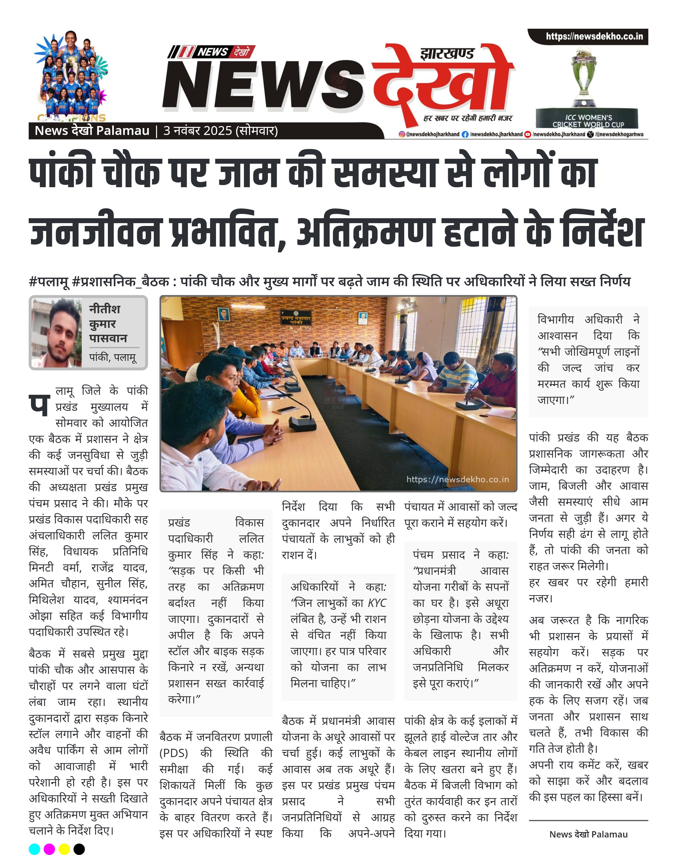 #पलामू #प्रशासनिक_बैठक : पांकी चौक और मुख्य मार्गों पर बढ़ते जाम की स्थिति पर अधिकारियों ने लिया सख्त निर्णय पांकी चौक समेत कई मुख्य चौराहों पर दुकानों के बाहर स्टॉल और खड़ी बाइक से घंटों जाम की स्थिति बनी रहती है। प्रखंड विकास पदाधिकारी ललित कुमार सिंह ने अतिक्रमण मुक्त अभियान चलाने का निर्देश दिया। जनवितरण प्रणाली दुकानदारों को अपने पंचायत क्षेत्र में ही राशन वितरण करने का आदेश। प्रधानमंत्री आवास योजना के अधूरे आवास जल्द पूर्ण करने के निर्देश,…
