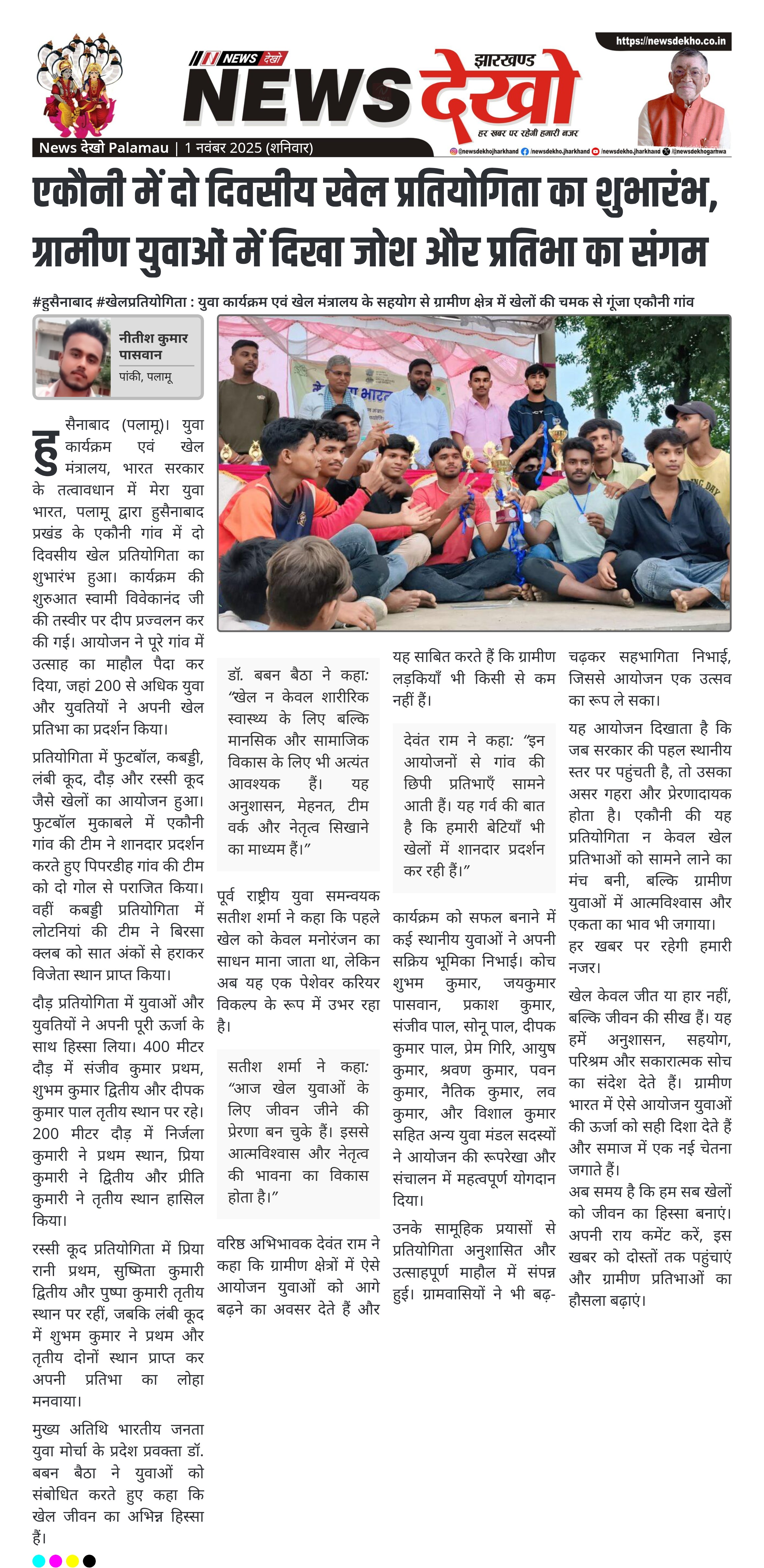 #हुसैनाबाद #खेलप्रतियोगिता : युवा कार्यक्रम एवं खेल मंत्रालय के सहयोग से ग्रामीण क्षेत्र में खेलों की चमक से गूंजा एकौनी गांव मेरा युवा भारत, पलामू के तत्वावधान में दो दिवसीय खेल प्रतियोगिता का आयोजन। 200 से अधिक युवा-युवतियों ने फुटबॉल, कबड्डी, दौड़, लंबी कूद और रस्सी कूद में भाग लिया। डॉ. बबन बैठा और सतीश शर्मा जैसे अतिथियों ने युवाओं को खेल के महत्व पर प्रेरित किया। एकौनी की फुटबॉल टीम और लोटनियां की कबड्डी टीम ने अपने-अपने खेलों में…