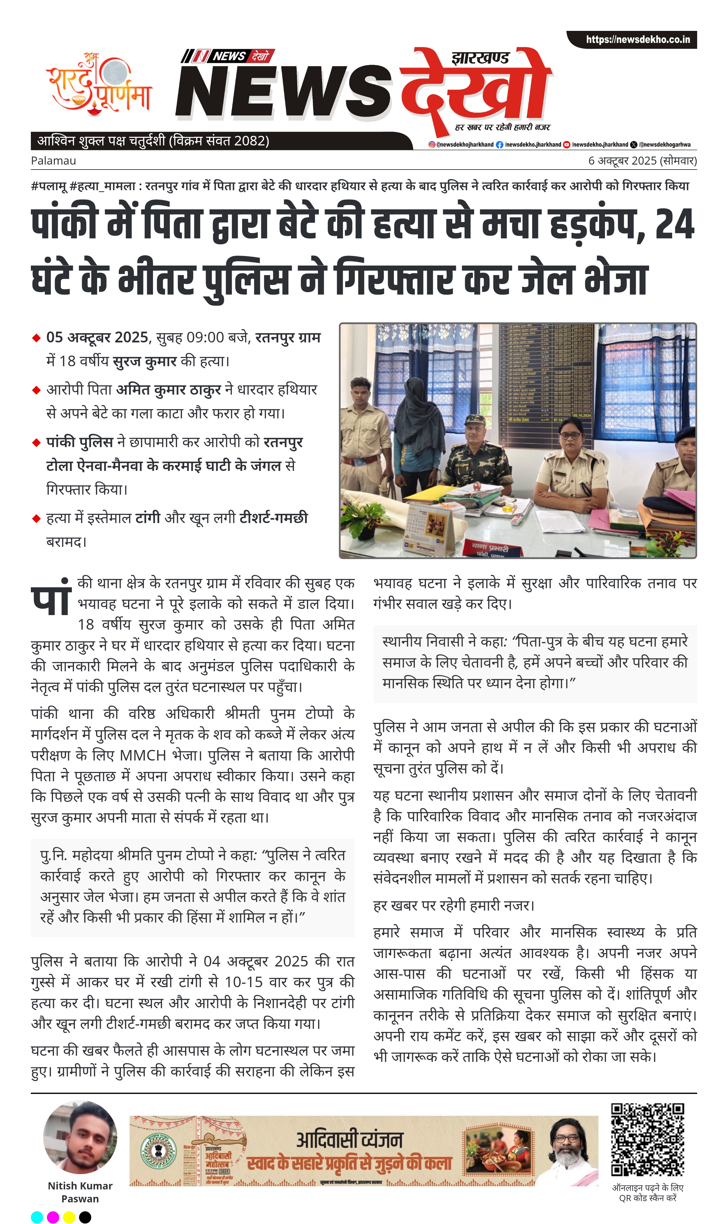 #पलामू #हत्या_मामला : रतनपुर गांव में पिता द्वारा बेटे की धारदार हथियार से हत्या के बाद पुलिस ने त्वरित कार्रवाई कर आरोपी को गिरफ्तार किया 05 अक्टूबर 2025, सुबह 09:00 बजे, रतनपुर ग्राम में 18 वर्षीय सुरज कुमार की हत्या। आरोपी पिता अमित कुमार ठाकुर ने धारदार हथियार से अपने बेटे का गला काटा और फरार हो गया। पांकी पुलिस ने छापामारी कर आरोपी को रतनपुर टोला ऐनवा-मैनवा के करमाई घाटी के जंगल से गिरफ्तार किया। हत्या में इस्तेमाल टांगी…