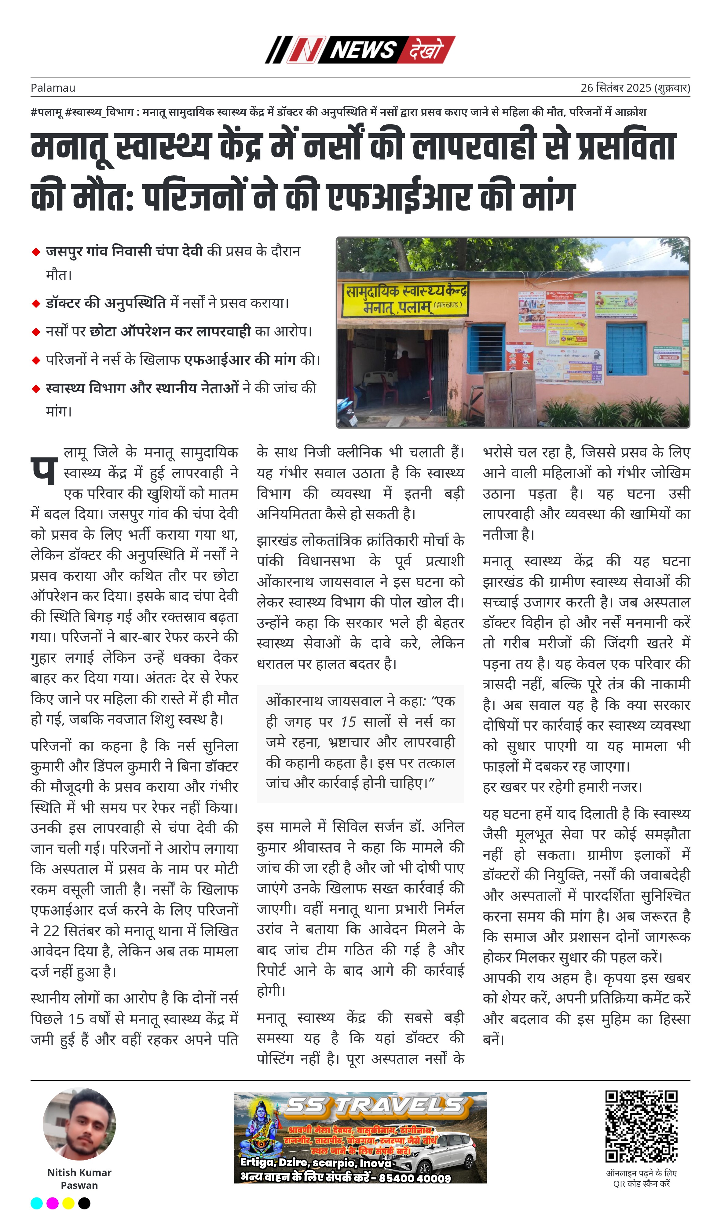 #पलामू #स्वास्थ्य_विभाग : मनातू सामुदायिक स्वास्थ्य केंद्र में डॉक्टर की अनुपस्थिति में नर्सों द्वारा प्रसव कराए जाने से महिला की मौत, परिजनों में आक्रोश जसपुर गांव निवासी चंपा देवी की प्रसव के दौरान मौत। डॉक्टर की अनुपस्थिति में नर्सों ने प्रसव कराया। नर्सों पर छोटा ऑपरेशन कर लापरवाही का आरोप। परिजनों ने नर्स के खिलाफ एफआईआर की मांग की। स्वास्थ्य विभाग और स्थानीय नेताओं ने की जांच की मांग। पलामू जिले के मनातू सामुदायिक स्वास्थ्य केंद्र में हुई लापरवाही ने…