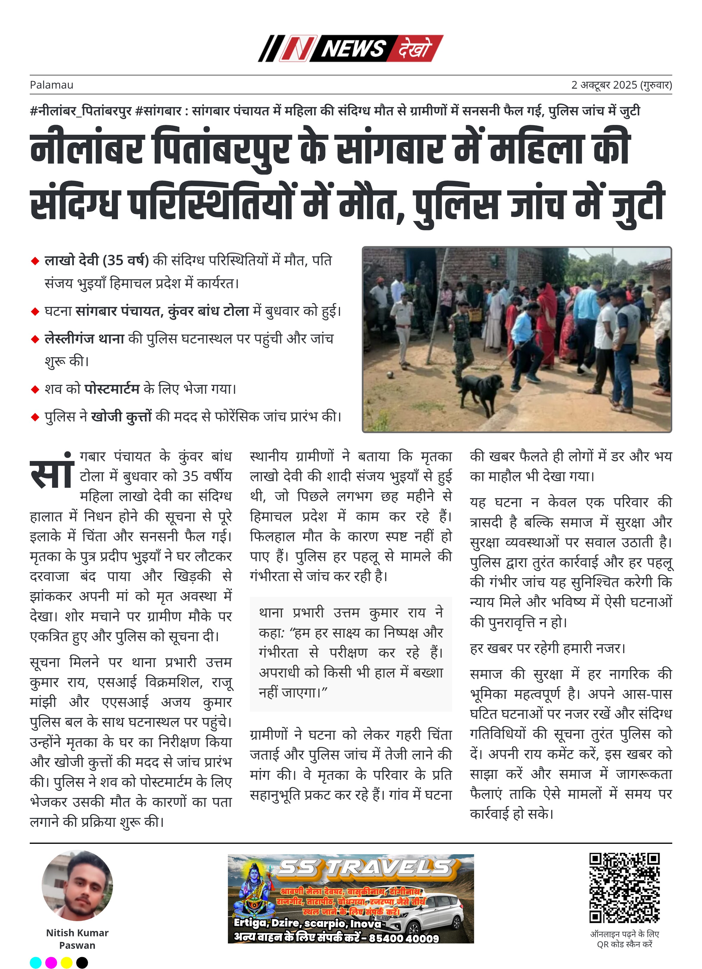 #नीलांबर_पितांबरपुर #सांगबार : सांगबार पंचायत में महिला की संदिग्ध मौत से ग्रामीणों में सनसनी फैल गई, पुलिस जांच में जुटी लाखो देवी (35 वर्ष) की संदिग्ध परिस्थितियों में मौत, पति संजय भुइयाँ हिमाचल प्रदेश में कार्यरत। घटना सांगबार पंचायत, कुंवर बांध टोला में बुधवार को हुई। लेस्लीगंज थाना की पुलिस घटनास्थल पर पहुंची और जांच शुरू की। शव को पोस्टमार्टम के लिए भेजा गया। पुलिस ने खोजी कुत्तों की मदद से फोरेंसिक जांच प्रारंभ की। सांगबार पंचायत के कुंवर बांध…