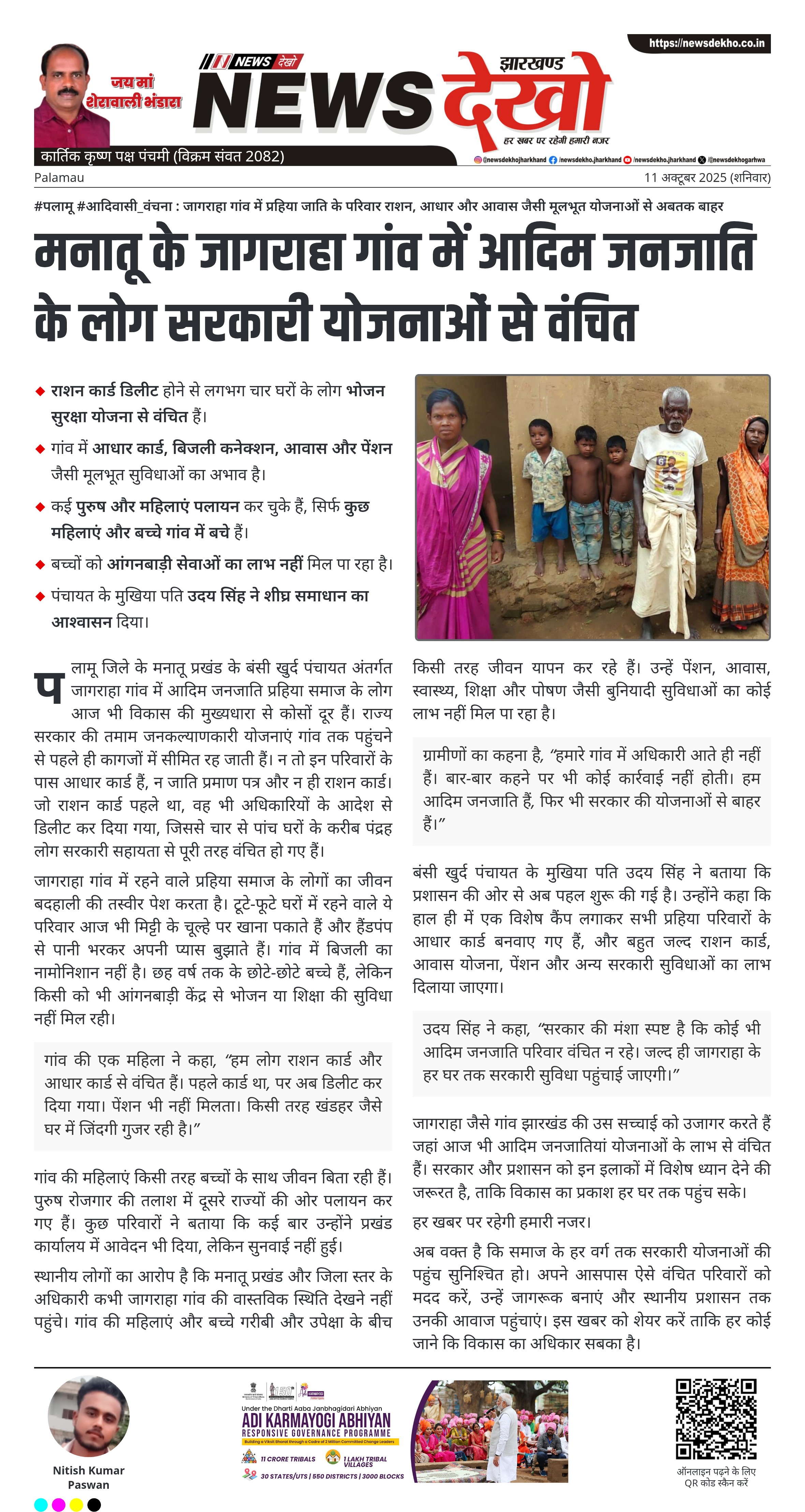 #पलामू #आदिवासी_वंचना : जागराहा गांव में प्रहिया जाति के परिवार राशन, आधार और आवास जैसी मूलभूत योजनाओं से अबतक बाहर जागराहा गांव में आदिम जनजाति प्रहिया समाज के परिवार किसी भी सरकारी योजना का लाभ नहीं पा रहे हैं। राशन कार्ड डिलीट होने से लगभग चार घरों के लोग भोजन सुरक्षा योजना से वंचित हैं। गांव में आधार कार्ड, बिजली कनेक्शन, आवास और पेंशन जैसी मूलभूत सुविधाओं का अभाव है। कई पुरुष और महिलाएं पलायन कर चुके हैं, सिर्फ कुछ…