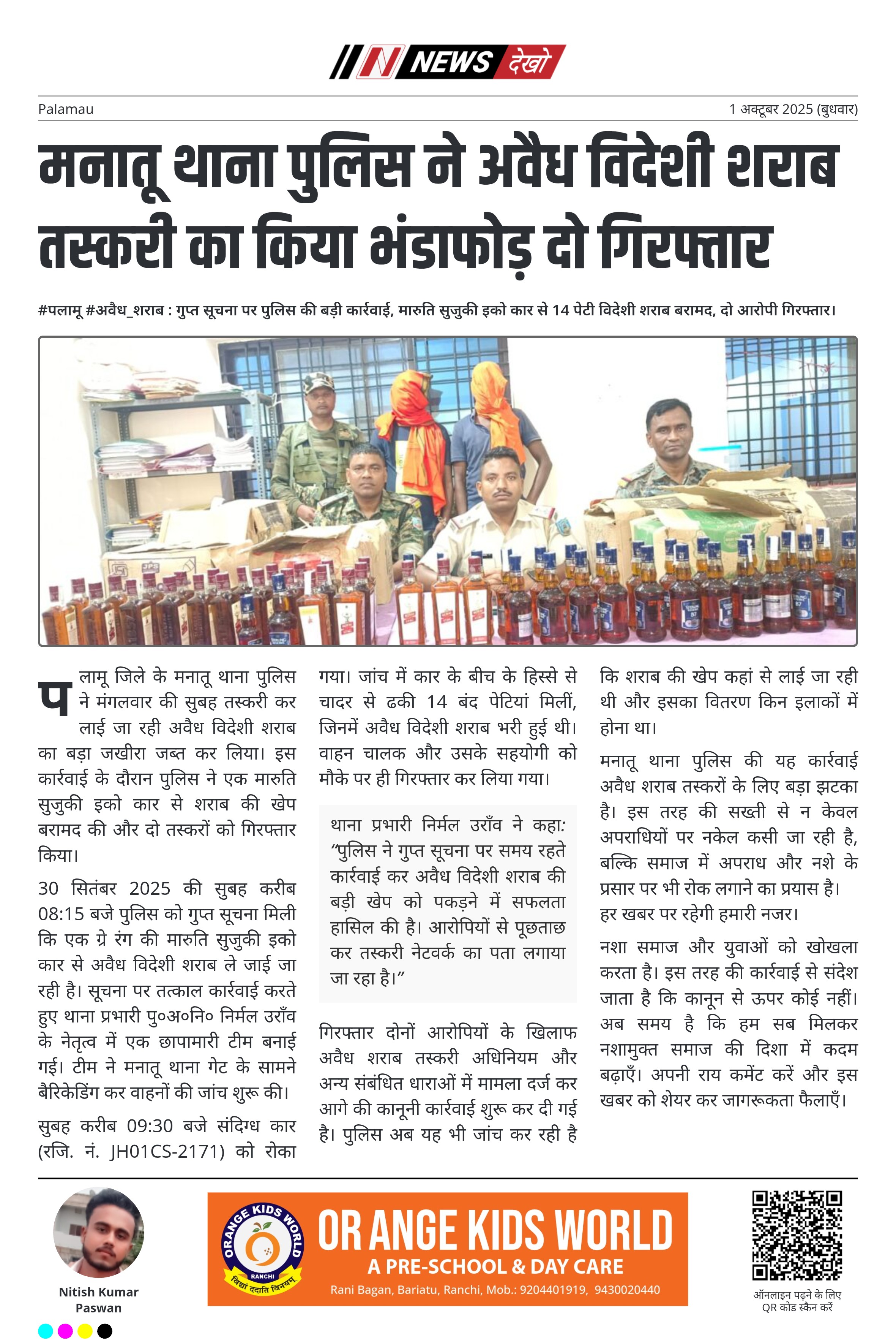 #पलामू #अवैध_शराब : गुप्त सूचना पर पुलिस की बड़ी कार्रवाई, मारुति सुजुकी इको कार से 14 पेटी विदेशी शराब बरामद, दो आरोपी गिरफ्तार। मनातू थाना पुलिस ने गुप्त सूचना के आधार पर बड़ी कार्रवाई की। संदिग्ध मारुति सुजुकी इको कार (JH01CS-2171) से 14 पेटी अवैध विदेशी शराब बरामद। थाना प्रभारी निर्मल उराँव के नेतृत्व में छापामारी टीम का गठन हुआ। घटना सुबह 30 सितंबर 2025 को करीब 09:30 बजे हुई। चालक और सहयोगी को गिरफ्तार कर कानूनी कार्रवाई शुरू। पलामू…
