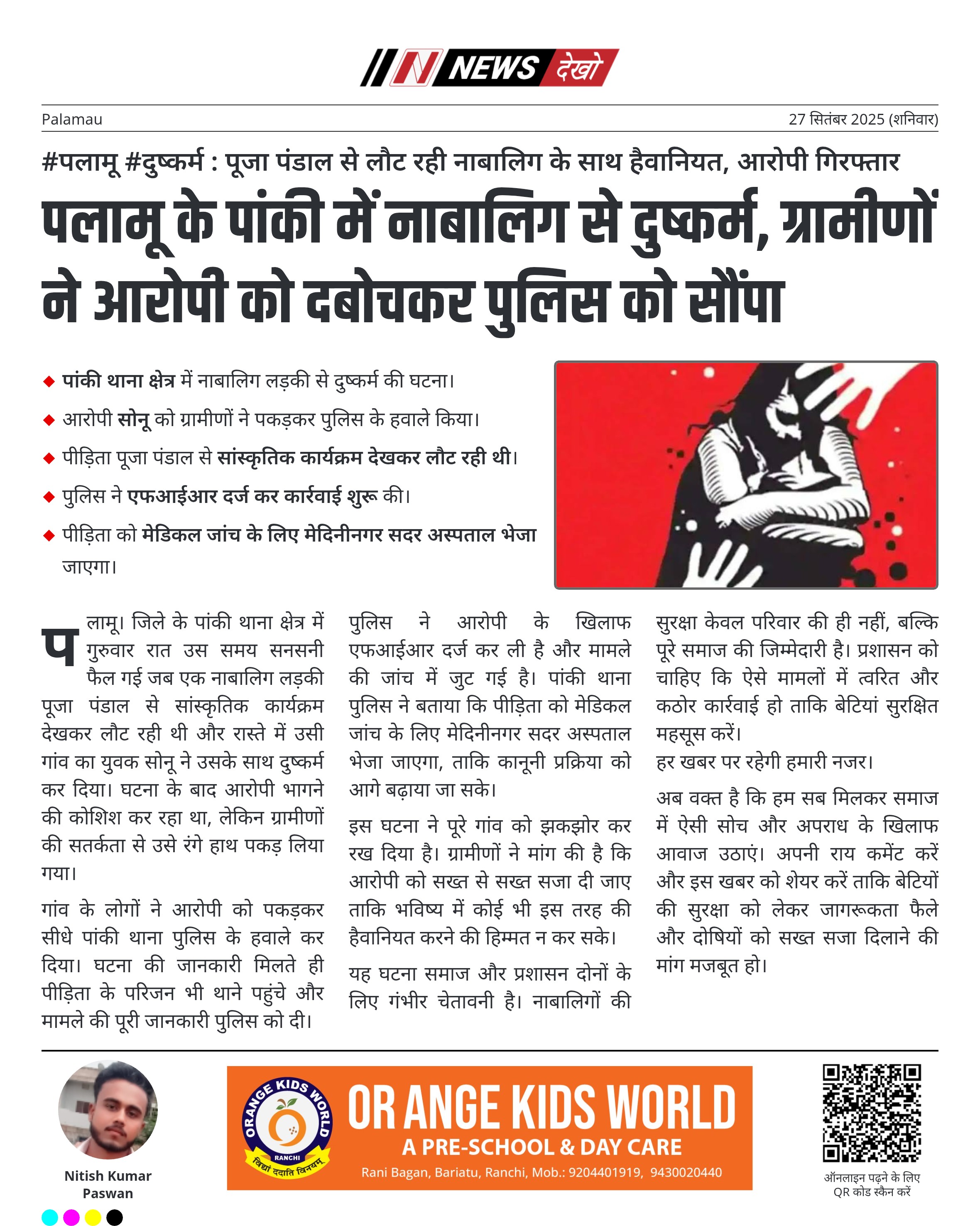 #पलामू #दुष्कर्म : पूजा पंडाल से लौट रही नाबालिग के साथ हैवानियत, आरोपी गिरफ्तार पांकी थाना क्षेत्र में नाबालिग लड़की से दुष्कर्म की घटना। आरोपी सोनू को ग्रामीणों ने पकड़कर पुलिस के हवाले किया। पीड़िता पूजा पंडाल से सांस्कृतिक कार्यक्रम देखकर लौट रही थी। पुलिस ने एफआईआर दर्ज कर कार्रवाई शुरू की। पीड़िता को मेडिकल जांच के लिए मेदिनीनगर सदर अस्पताल भेजा जाएगा। पलामू। जिले के पांकी थाना क्षेत्र में गुरुवार रात उस समय सनसनी फैल गई जब एक नाबालिग…