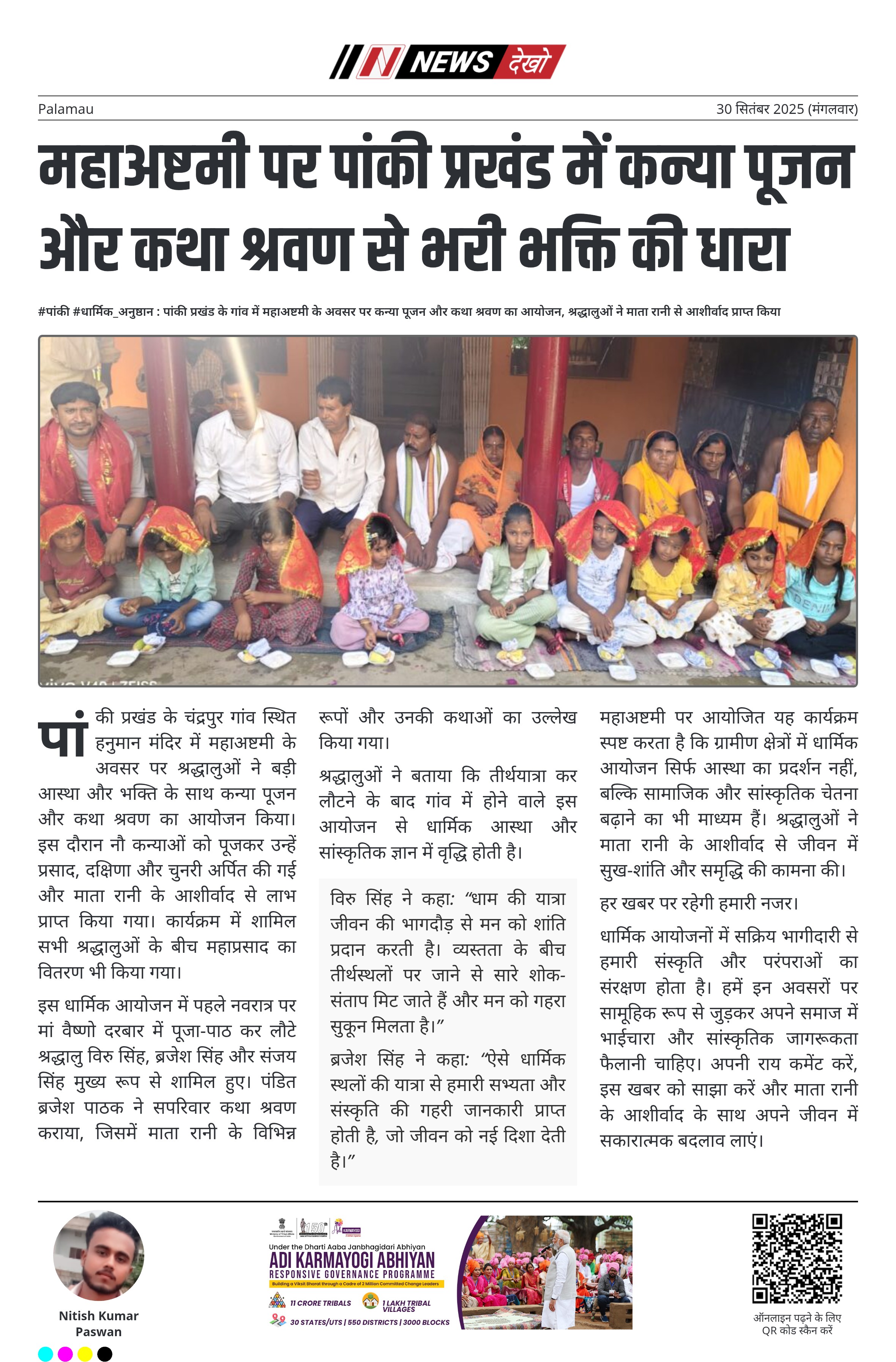 #पांकी #धार्मिक_अनुष्ठान : पांकी प्रखंड के गांव में महाअष्टमी के अवसर पर कन्या पूजन और कथा श्रवण का आयोजन, श्रद्धालुओं ने माता रानी से आशीर्वाद प्राप्त किया पांकी प्रखंड के चंद्रपुर गांव स्थित हनुमान मंदिर में महाअष्टमी के अवसर पर धार्मिक आयोजन सम्पन्न हुआ। नौ कन्याओं को पूजकर प्रसाद, दक्षिणा और चुनरी अर्पित की गई। कथा श्रवण का आयोजन पंडित ब्रजेश पाठक ने किया, जिसमें ग्रामीण और श्रद्धालु शामिल हुए। तीर्थयात्रा कर लौटे श्रद्धालु विरु सिंह, ब्रजेश सिंह और संजय…