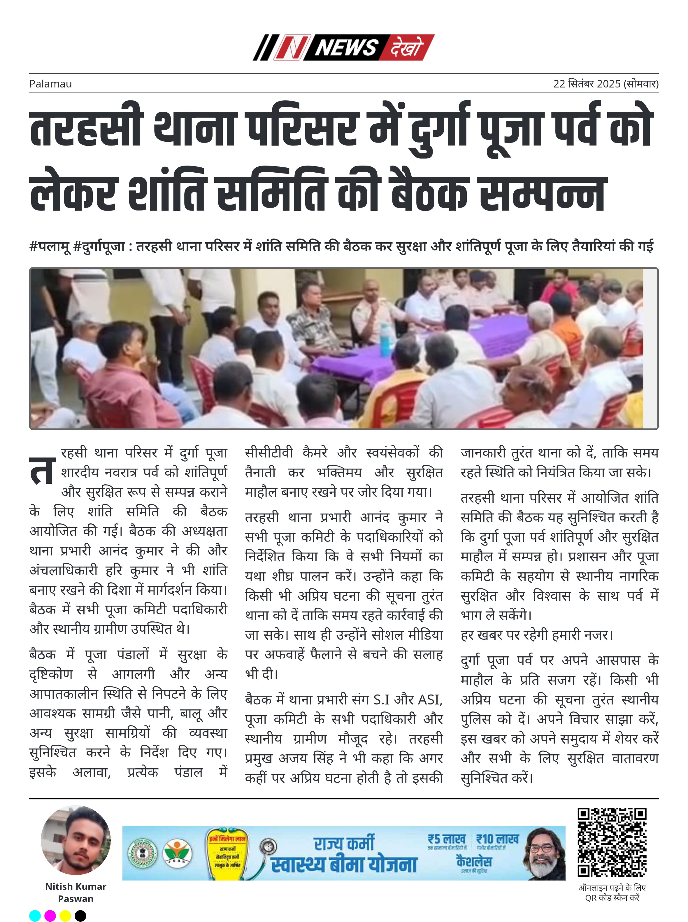 #पलामू #दुर्गापूजा : तरहसी थाना परिसर में शांति समिति की बैठक कर सुरक्षा और शांतिपूर्ण पूजा के लिए तैयारियां की गई तरहसी थाना परिसर में दुर्गा पूजा शारदीय नवरात्र पर्व को लेकर शांति समिति की बैठक सम्पन्न। बैठक की अध्यक्षता तरहसी थाना प्रभारी आनंद कुमार ने की और अंचलाधिकारी हरि कुमार भी उपस्थित रहे। सुरक्षा और आपातकालीन स्थिति से निपटने हेतु पूजा पंडालों में पानी, बालू और अन्य सामग्री रखने के निर्देश दिए गए। प्रत्येक पूजा स्थल पर सीसीटीवी कैमरे…