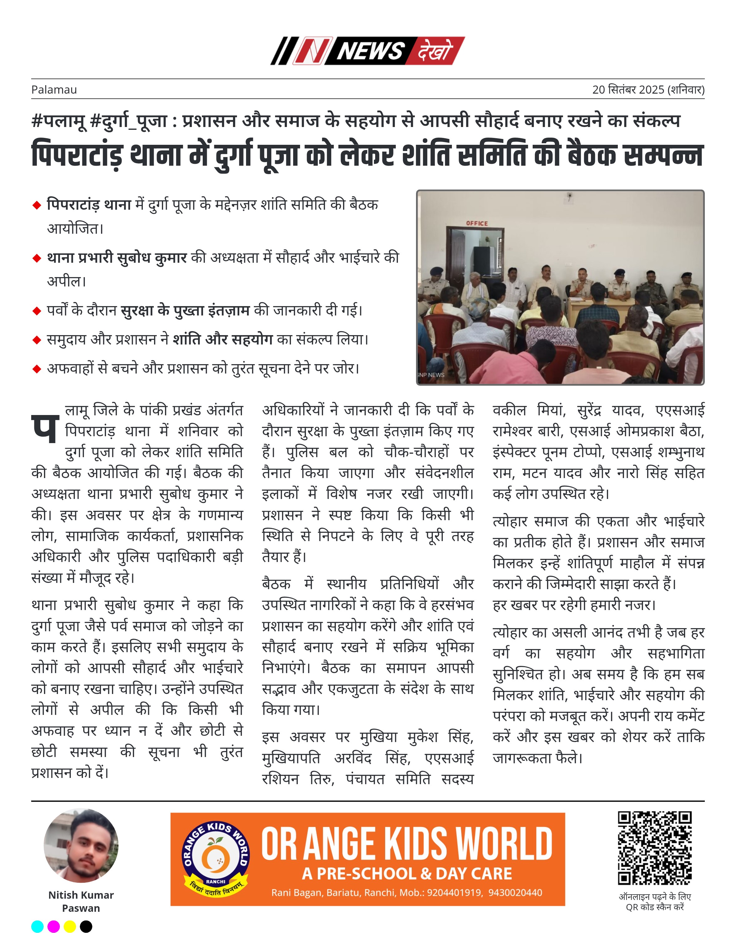 #पलामू #दुर्गा_पूजा : प्रशासन और समाज के सहयोग से आपसी सौहार्द बनाए रखने का संकल्प पिपराटांड़ थाना में दुर्गा पूजा के मद्देनज़र शांति समिति की बैठक आयोजित। थाना प्रभारी सुबोध कुमार की अध्यक्षता में सौहार्द और भाईचारे की अपील। पर्वों के दौरान सुरक्षा के पुख्ता इंतज़ाम की जानकारी दी गई। समुदाय और प्रशासन ने शांति और सहयोग का संकल्प लिया। अफवाहों से बचने और प्रशासन को तुरंत सूचना देने पर जोर। पलामू जिले के पांकी प्रखंड अंतर्गत पिपराटांड़ थाना में…